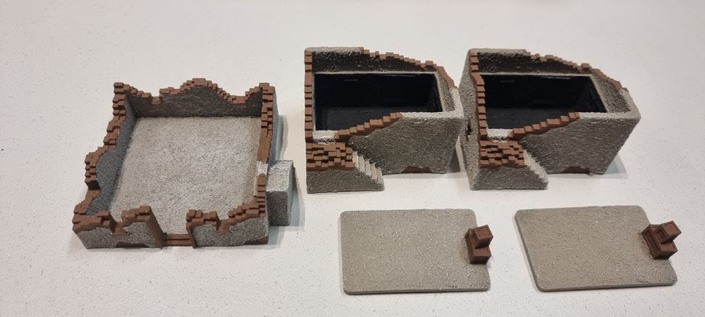 All three buildings are decently, though extremely simply detailed for what they are. The building interiors have windows and doors sculpted in corresponding places to the exteriors, though they’re entirely painted black. The pieces are all textured in a simple coat of rough, textured paint that has been given a simple drybrush. There’s a small amount of variation in the finish between the pieces, which makes sense as they’re clearly the products of a prodution line – though it’s not something that bothered me.