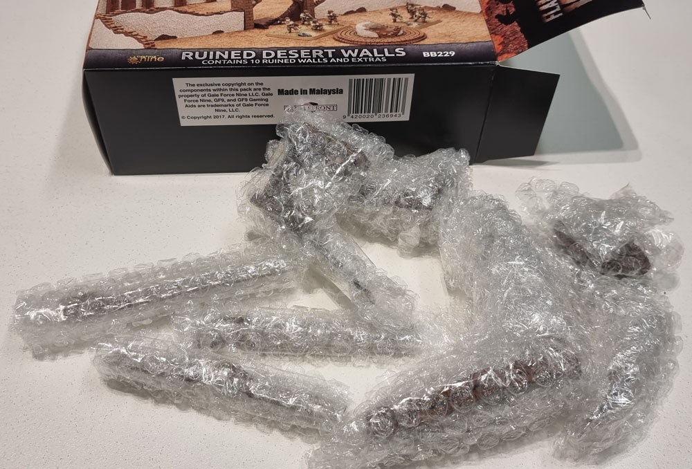 Unlike the regular (undamaged) walls, there’s no taped-in card wraparound, these ones came loose inside, but at least they’re still bubble wrapped and have a cardboard shell.