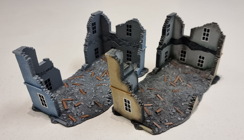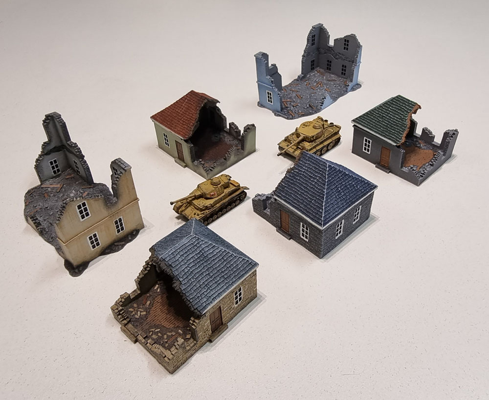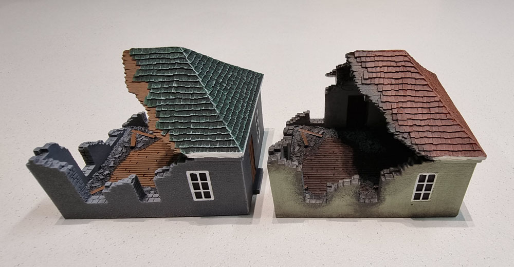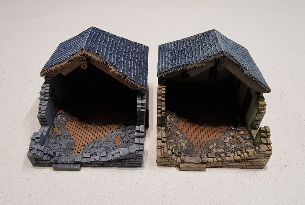 I knew immediately that I wanted to give these a complete repaint rather than a weathering – since these are European houses rather than desert village-type structures, they’d stand out a lot more if I had two identical sets, especially if placed in close proximity to one another – which they would often be – because bombed villages often work like that. My repainted ones are on the right hand side in these images throughout the post.