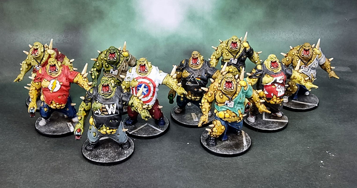 And to finish – the usual! A group shot! This pic of all of the 10 in the set also features the Captain America and Dark Side of the Moon Fatties that I finished way back in May of this year. Now I’ve just started to work on the regular fatties, though I do need to go through the rather tedious base texturing before I can get to the more enjoyable stuff, and most of them aren’t dressed for as much painting fun as the t-shirt brigade of this lot…