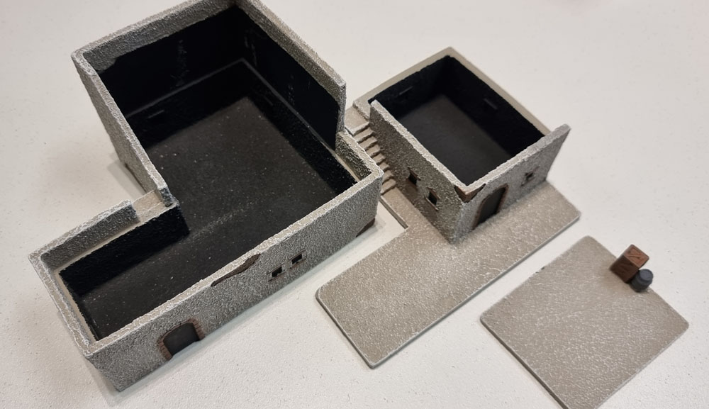 Showing the interior and rooftops with FoW infantry stands in place, so you can see how many fit. Three in the ground floor, 1 inside in the first floor and one on the landing, and one on the roof.