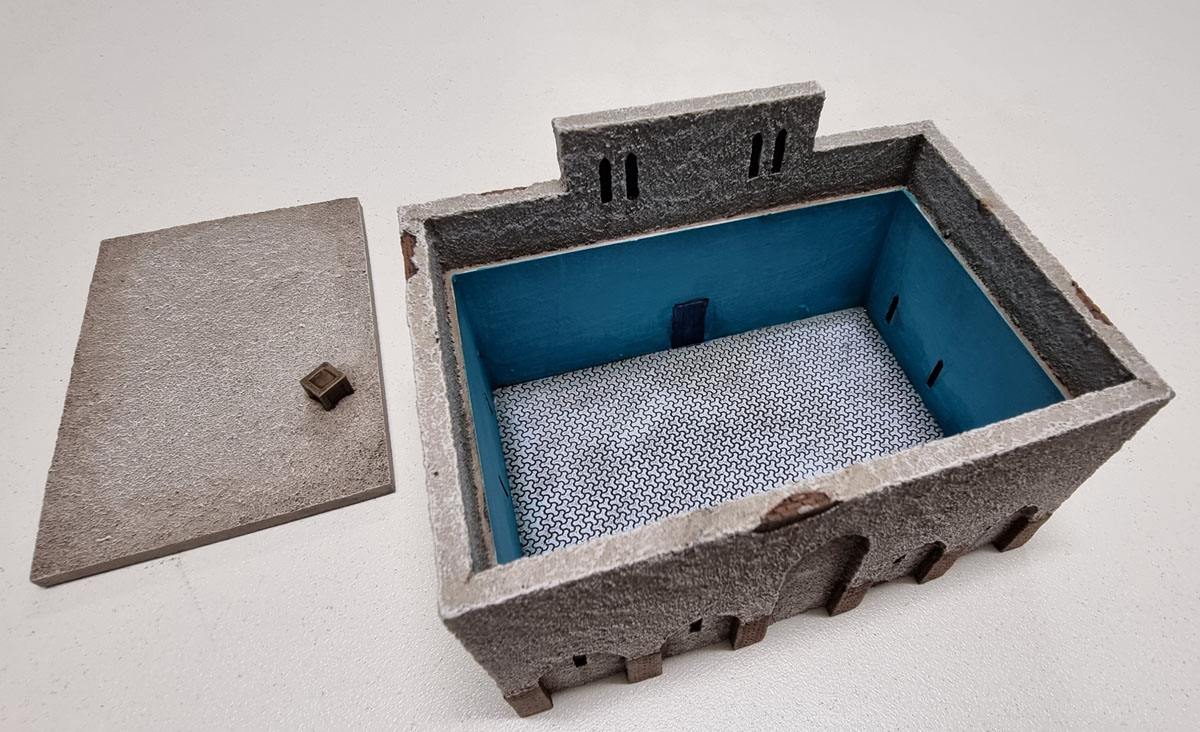 Given that this building had previously been sold as a Mosque, I decided to run with that option and paint the bare black walls a more tranquil colour, as well as going over the tiles with a blue-grey before weathering both a little.