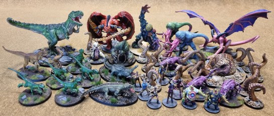 May had Monster MAYhem run by The Angry Piper at Dead Dick’s Tavern and Temporary Lodging. Inspired by his introduction post, I got a whole lot of reaper Bones stuff done with a focus on Dinosaurs, as well as several Shadows of Brimstone’s larger creatures that had been sitting around forever, frustratingly taking up space – and I finally got that bloody not-Balrog from the D&D boardgame done as well – which had also been sitting around frustrating me for a couple of years. There’s also a few more Zombicide models. I was really churning through those Zombicide Survivors at this point in time, and at one stage calulated that I’d have all of the opened ones completed in 6 weeks if I kept that pace. Spoiler Alert: I didn’t. I’m actually back at work on the Zombicide models now since we’ve been playing again, so (another Spoiler Alert), I’ll have more of those up shortly.