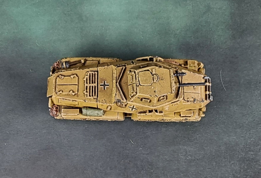 With my desert Panzers slowly coming to an end, next up was to get some of the ancillary models painted. I’ve always loved armoured cars, since I had a little Matchbox toy of a Daimler Dingo as a child, and I’ve also always liked the interesting angular shapes of German armoured cars and half-tracks. I probably thought that these unusual designs from the 1930’s and 40s looked futuristic back then. 🙂