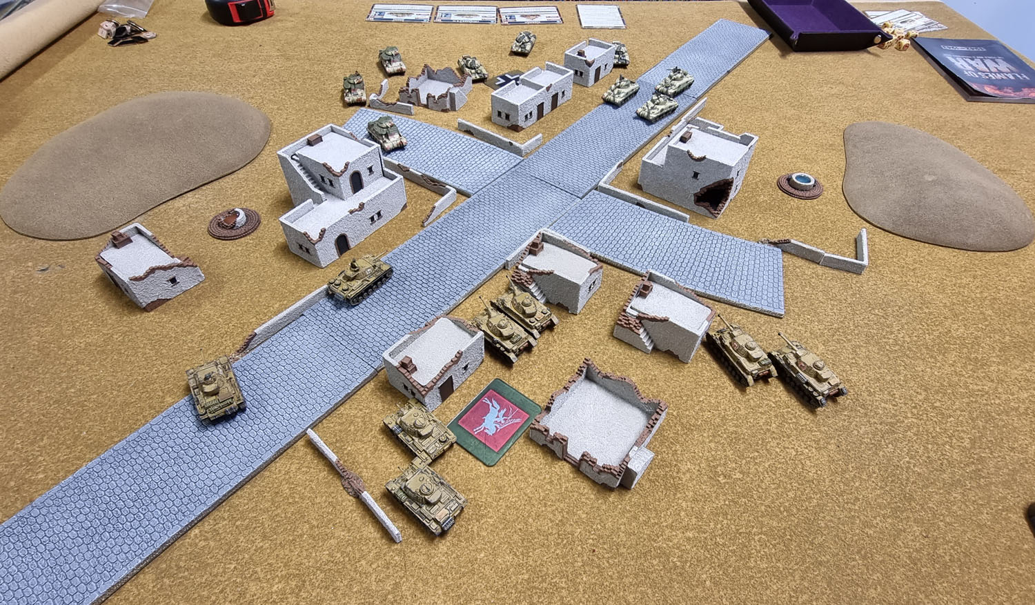 Here’s a photo of turn 1 of the first baby game Marouda and I had of FoW, back in November of 2021 when I took these photos and was crutching my way around the place. As you can see, the roads look pretty decent even though there aren’t many of them for the table.