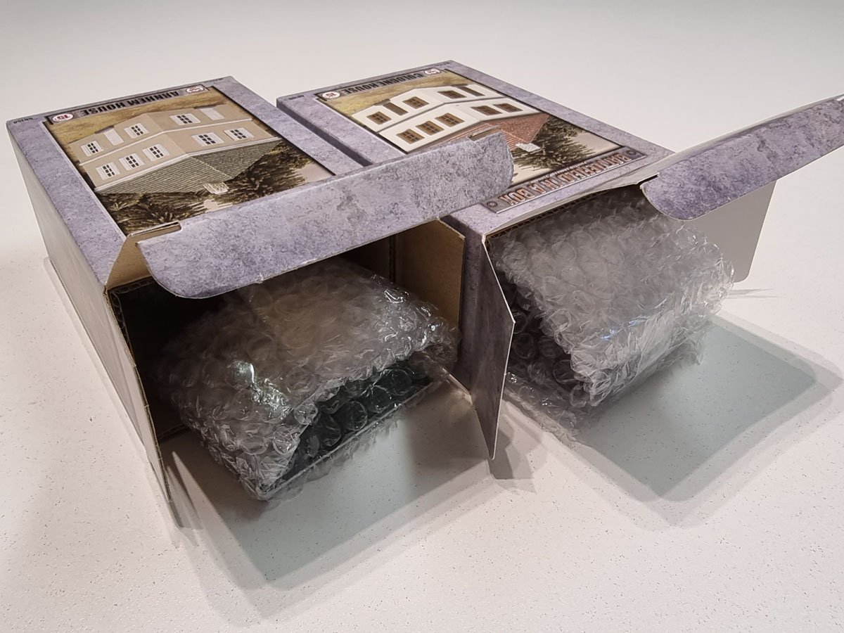 Opening the boxes, we see that the actual resin buildings are wrapped in bubble wrap while there’s a square of cardboard that serves to reinforce the thin printed card of the outer “retail” box.