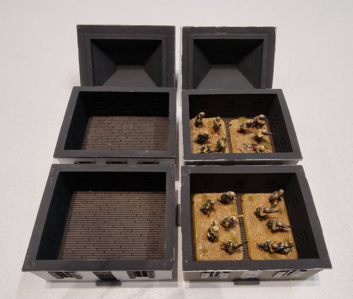 The interiors are what I’ve come to expect from Battlefront at this stage – simply painted floors with entirely black walls without doors or windows picked out in any way. I’ll eventually get to repainting the interiors of these and weathering the outside, but that hasn’t been any kind of priority and as such – it’s something I’ll get around to doing when I get to it. As you can also see, each level fits two standard infantry bases inside.