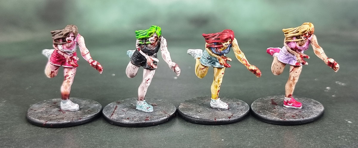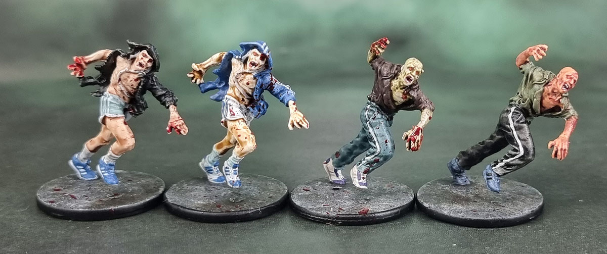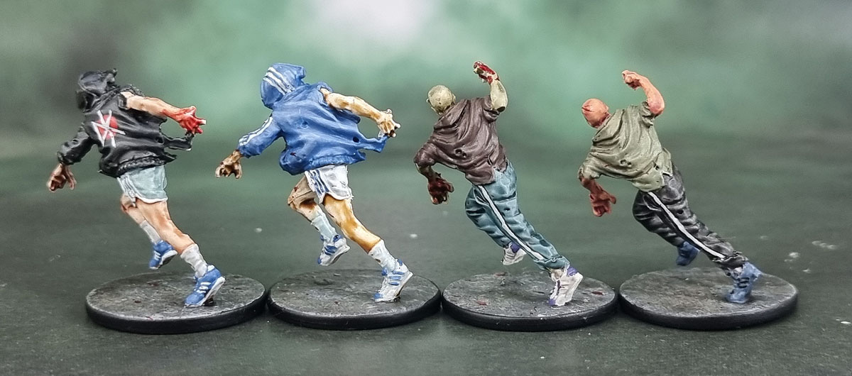 Oh, after I finished the dozen models that were the last of my Runner, I found another pair of them – so I had to prep and paint those two before blooding and photographing the ones I’d just completed. So we have 14 here. I find t-shirts tend to be the best surfaces to add modern pop culture references to. Shouldn’t go too far overkill, though – not everyonme wearing a t-shirt has a print, especially a back print – not that these zombies offer anything else. The one in the yellow and red outfit is either a superfan or Tomoaki Honma, but let’s pick those references!