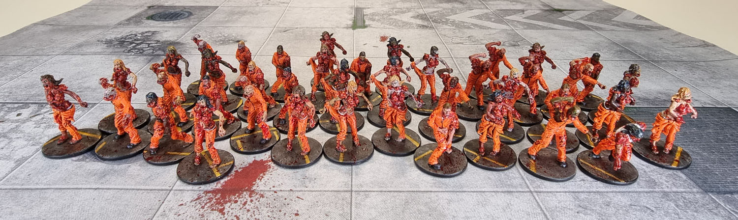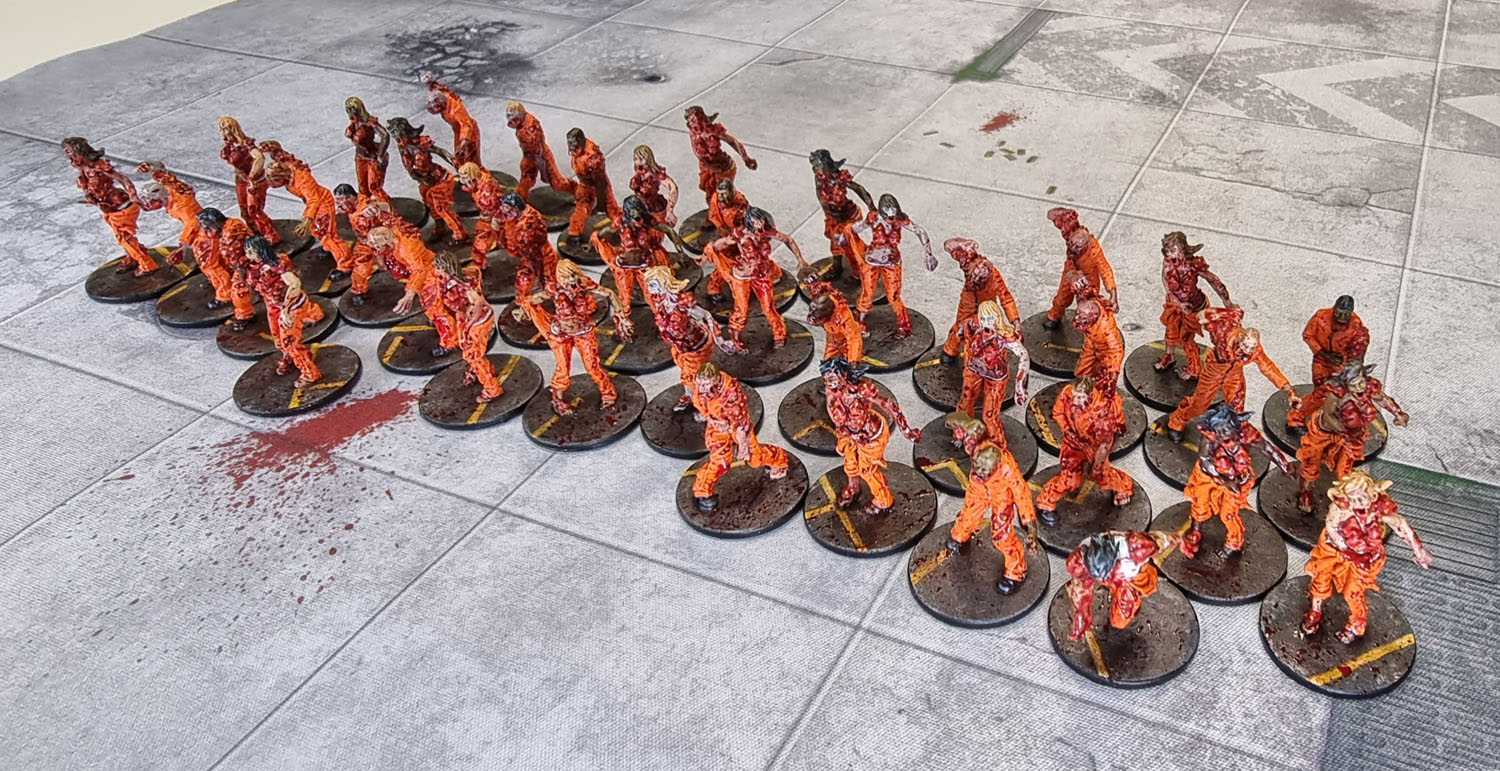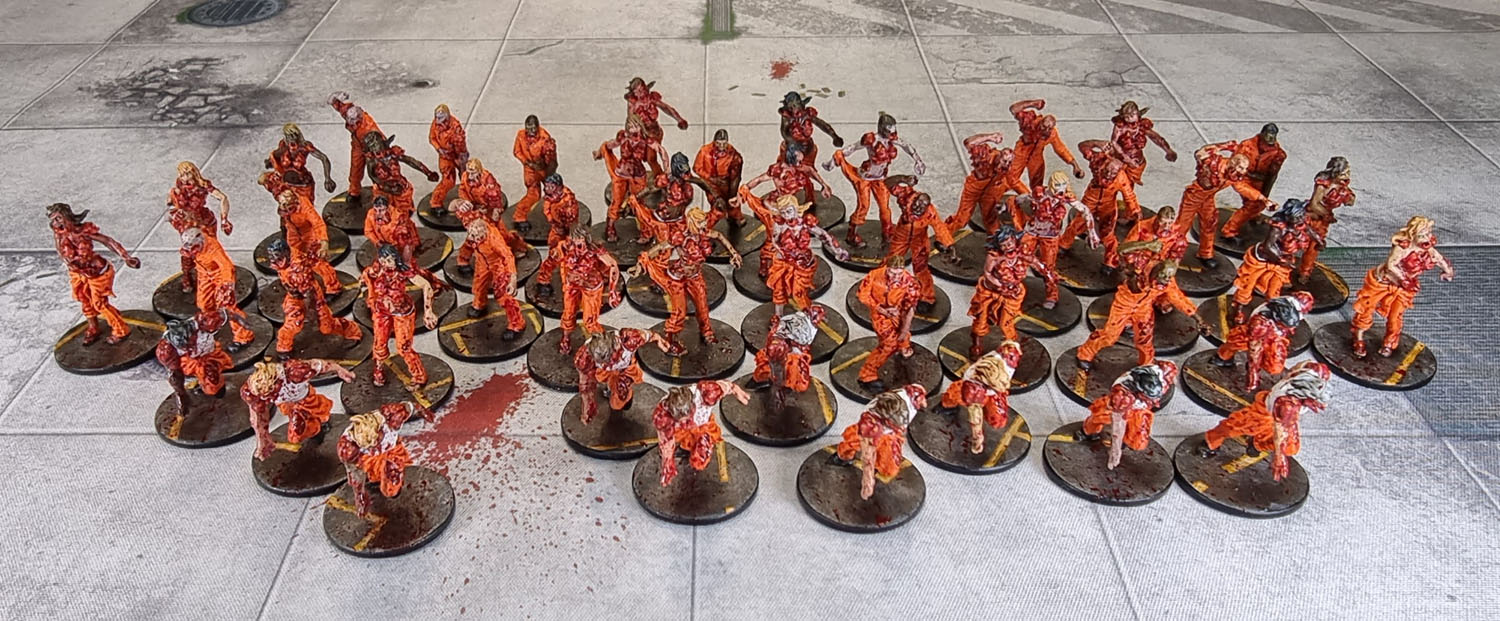So with this burst of concentration and effort, I managed to complete all of my Zombicide “Prisoner” Berseker Walkers – 42 models in all (plus another errant Runner that we found bringing it to 43) – inside 2 weeks. I’m pretty happy with that. The process became less and less pleasant the further into it I became, but I’ve now come out the other side and they’re all done! Well… almost done. I still have another 14 Berserker Walkers on the painting desk – though these next ones are the Prison Guards/Corrections Officers/Screws, so they’ll have their own distinct paint scheme from these prisoners.