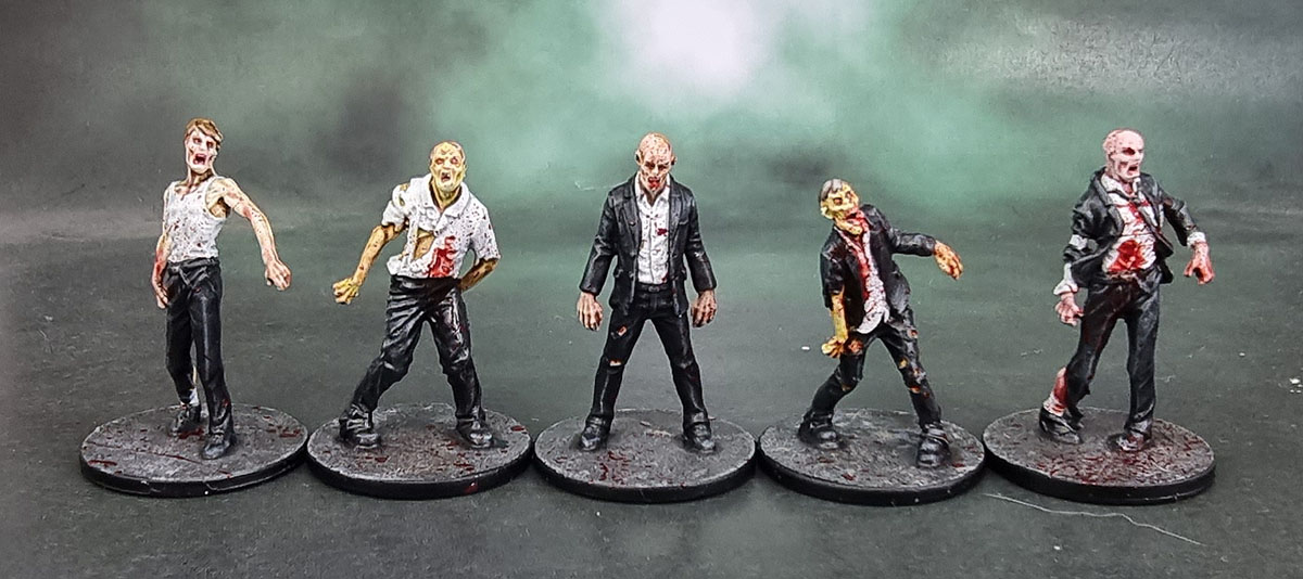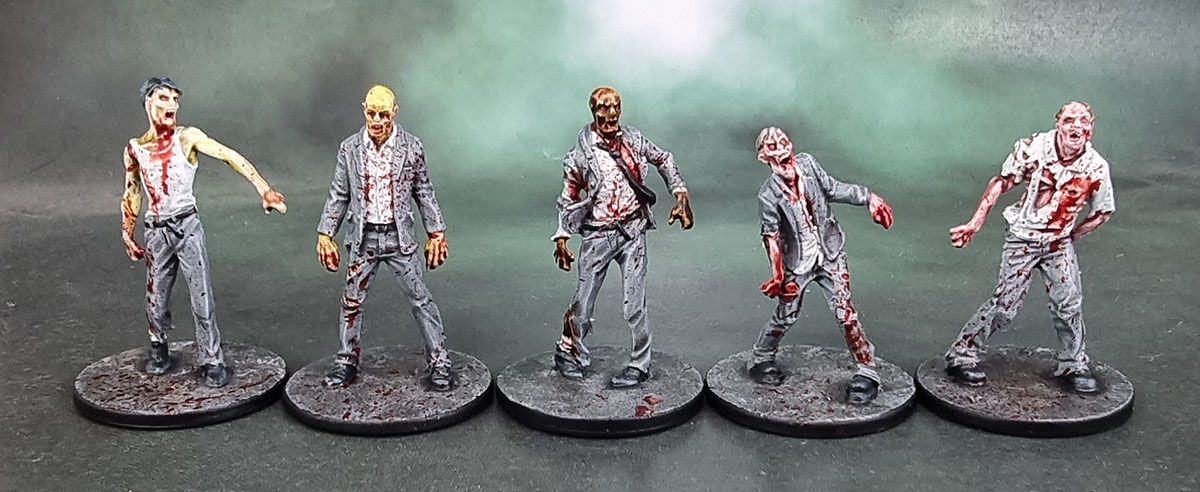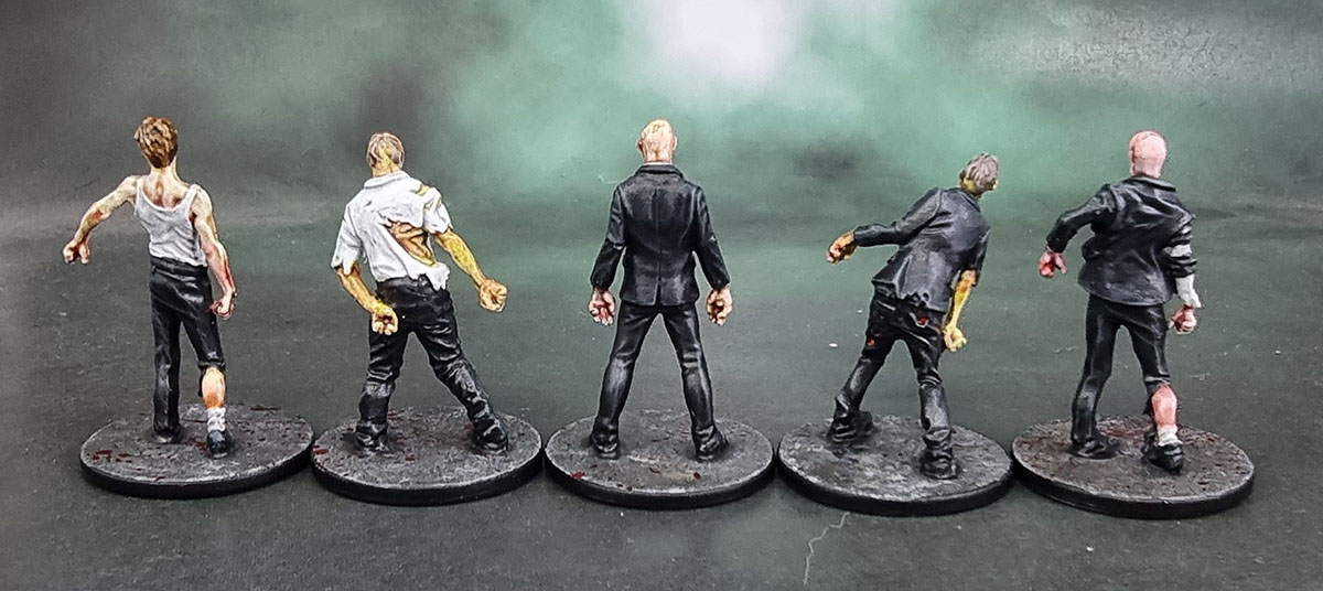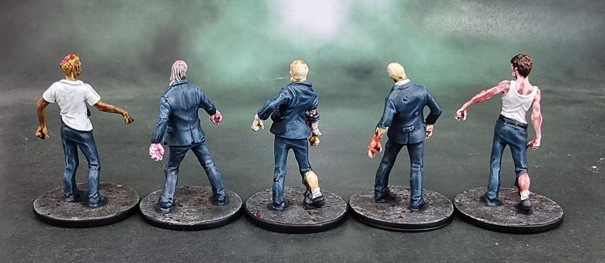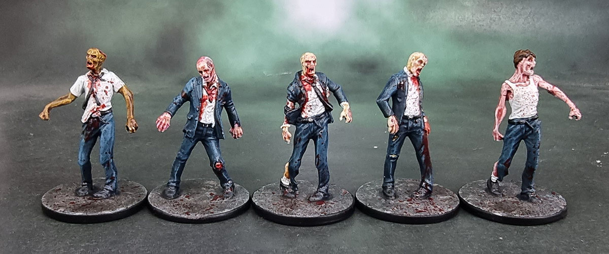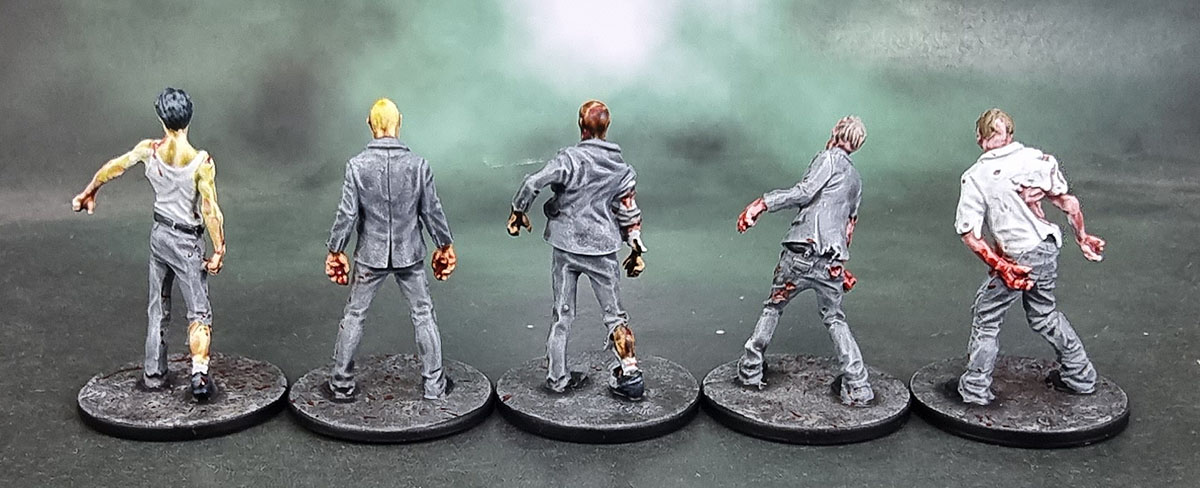 Since NotLD is a black and white film, the artists at CMoN filled in the palette of the characters’ clothing. They went for an overall shared palette of blues, beiges and pink/salmon across the ten survivors from the game and one small expansion box – so I basically just followed that. Judy’s got the whole double-denim thing going here, but it’s not her fault. Probably. I still hate painting OSL, so I did a simple job on Harry and his mason jar. Hopefully it looks decent while not being too garish or too subtle. I did enjoy the opportunity to practise my work on painting hair on these figures, and it’s something I’m still slowly improving on.