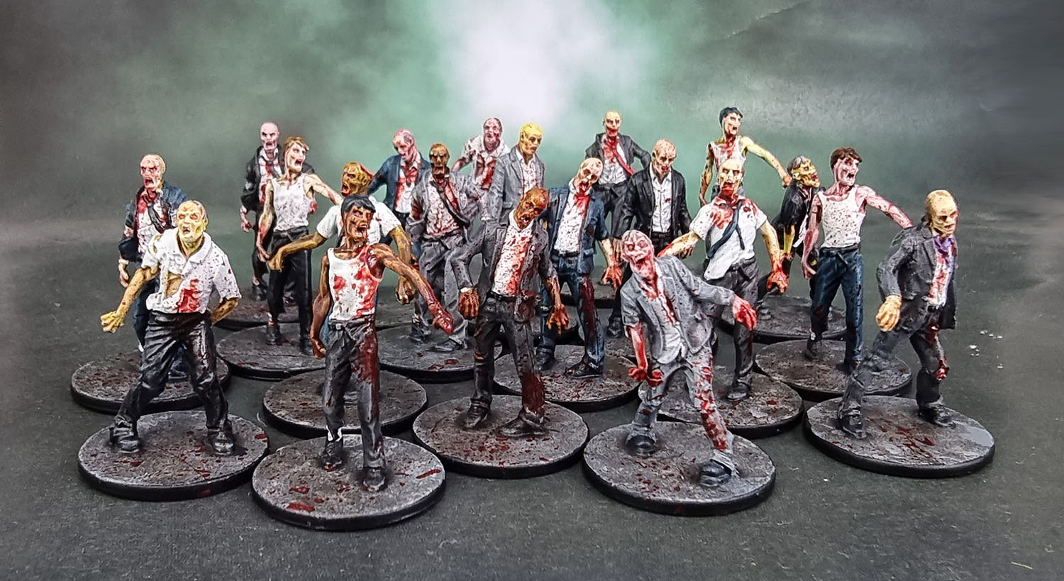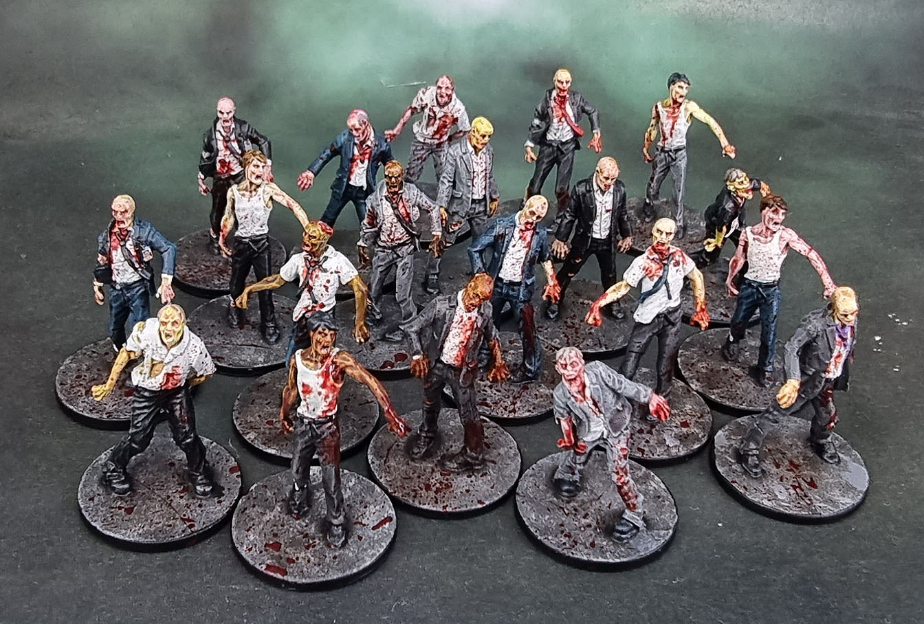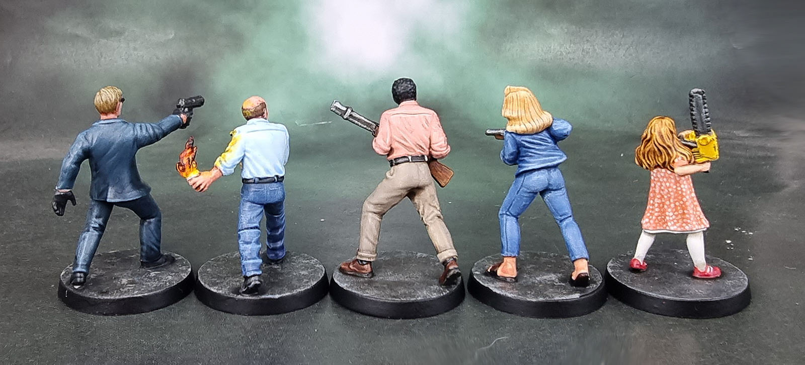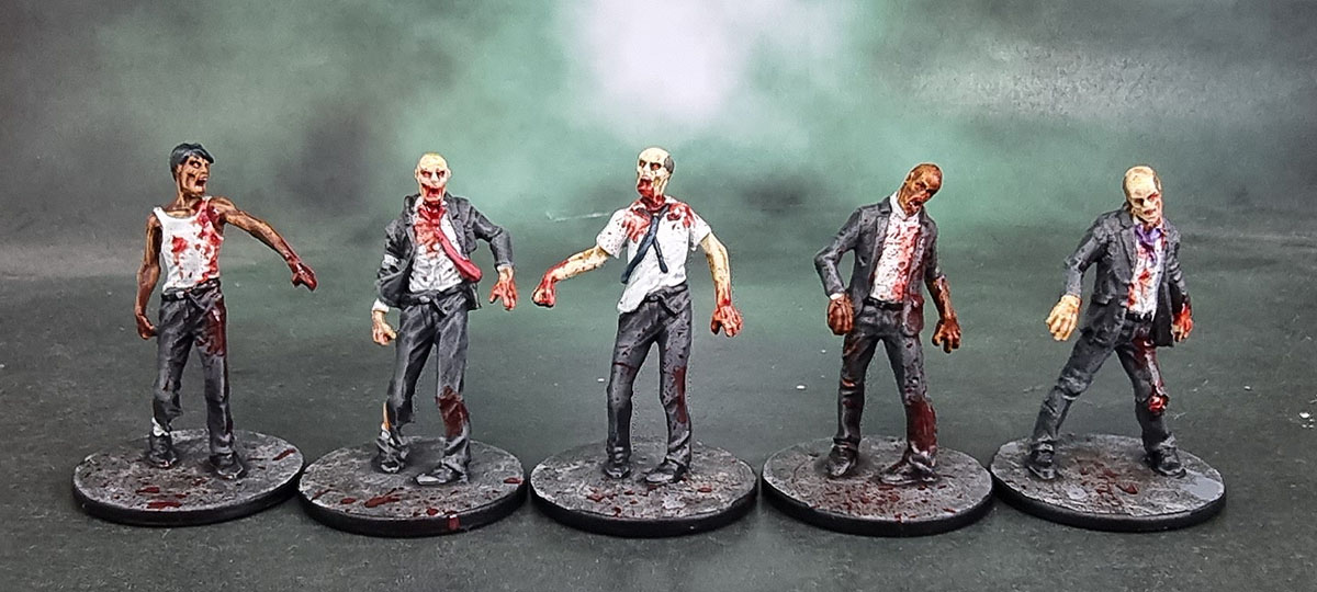 Since NotLD is a black and white film, the artists at CMoN filled in the palette of the characters’ clothing. They went for an overall shared palette of blues, beiges and pink/salmon across the ten survivors from the game and one small expansion box – so I basically just followed that. Judy’s got the whole double-denim thing going here, but it’s not her fault. Probably. I still hate painting OSL, so I did a simple job on Harry and his mason jar. Hopefully it looks decent while not being too garish or too subtle. I did enjoy the opportunity to practise my work on painting hair on these figures, and it’s something I’m still slowly improving on.
