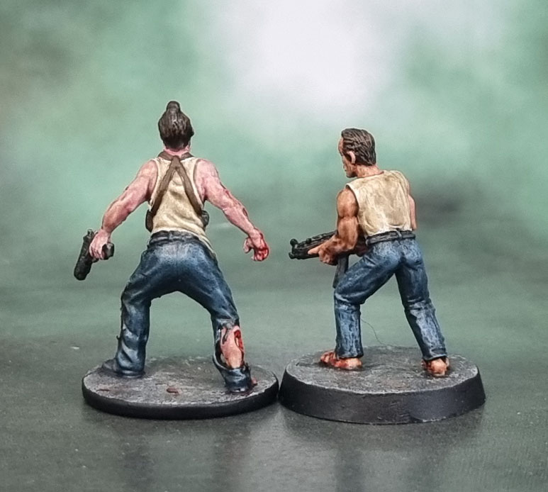Our second model for today represents “Nick Walker, Bad Cop”, which as you can see is “inspired by” Bruce Willis in the original Die Hard film. I got the official Nick Walker Zombie figure alongside the Cardboard Tube Samurai and a few others, and already had the other model “Walt” from Studio Miniatures. I feel that Walt is a bit of a mediocre sculpt to be quite honest, especially with regard to his singlet, but it’s overall decent enough for boardgame purposes.