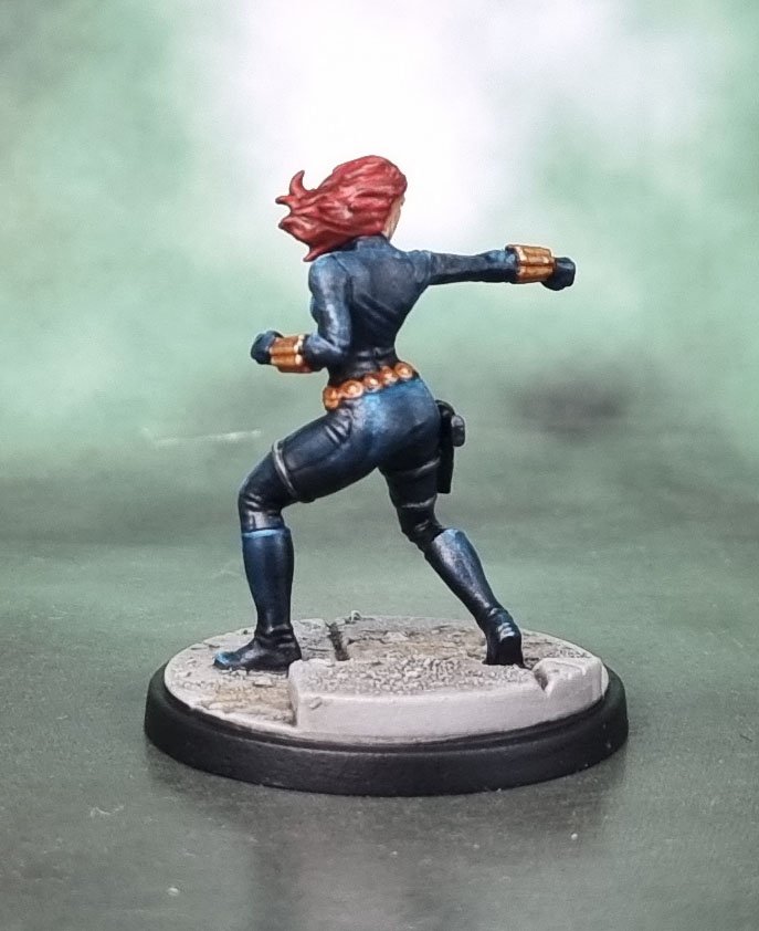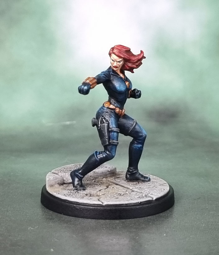 I went with a “comic book blue” kind of shading to Widow’s black outfit – different to the greys of how I painted Black Panther’s Zombicide model and the purple tones of Venom. (I’ll be doing the MCP version of Panther in the same greys when I get to him). Basically putting into practise some of the “tones of black” I wrote a little about when painting and then showing the Zombicide VIP Walker Goths.
