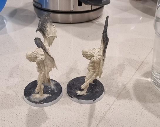 These two modela are the final pair for this little run of Cthulhu: Death May Die Mythos Creatures – at least until I get another one painted. Today we have some Byakhee. The design on these ones is rather different to the old model I painted years ago and fixed up a year ago. But then again, the background of Byakhee is almost interesting – a nameless creature (or creatures) in Lovecraft’s stories, they were named by a friend and publisher of HPL’s writings. So… fill yer boots, I guess!