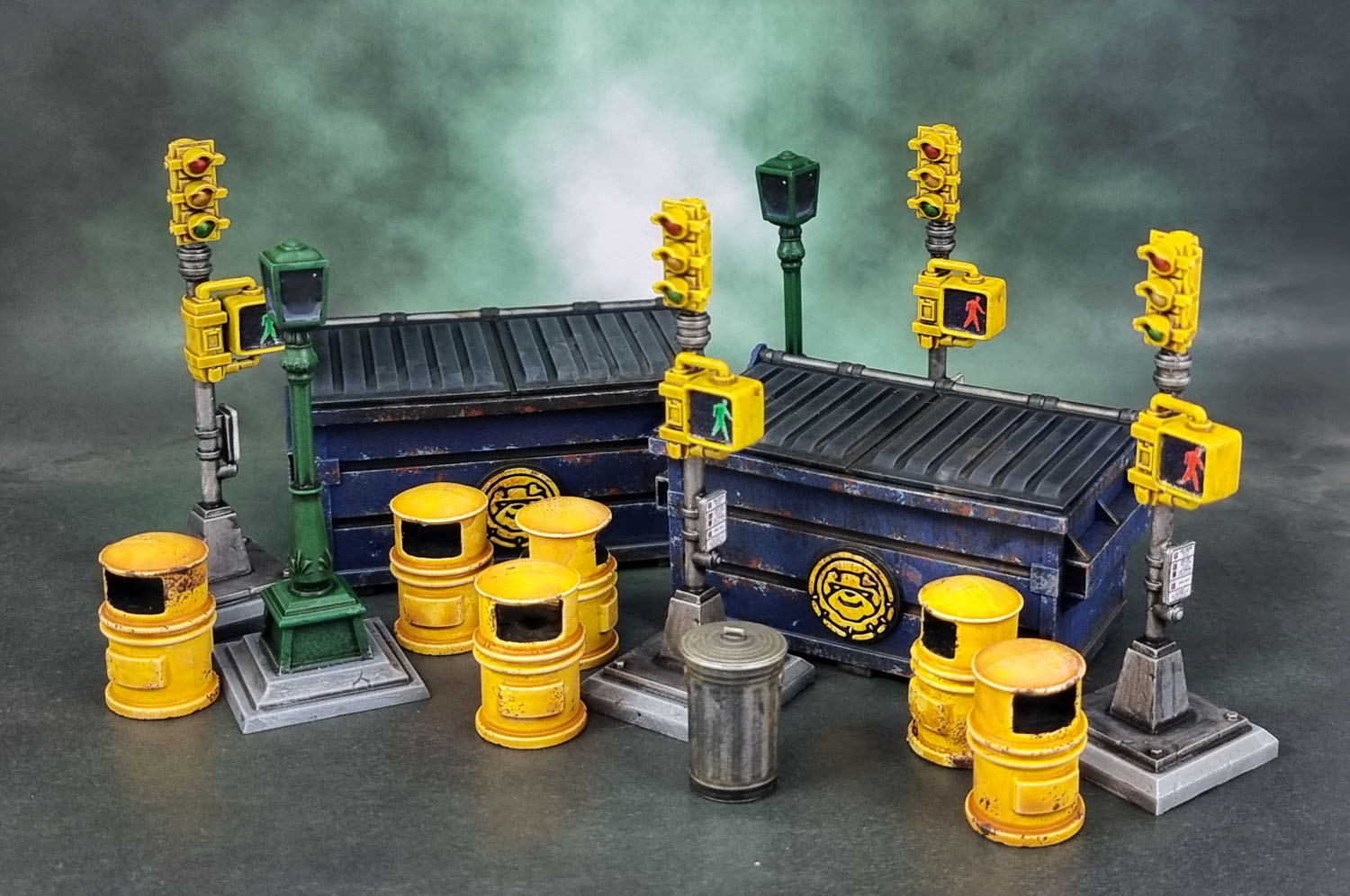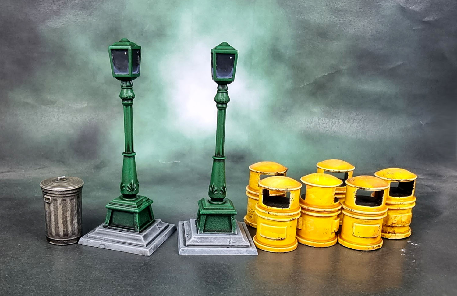 I also finished the single Rubbish Bin and the Street Lights from my second set. I’m pretty sure I painted the original Rubbish Bin in the past as well, but I’m not going to go searching for the link to it. These Mantic Bins used to be called “Mars Attacks” scenery, and that’s how mine were purchased as well as listed the last time I posted them but given that this particular licence has long expired and that the same terrain pieces still continue to be sold today as part of the Terrain Crate range, it only makes sense for me to call them that here. The previous bins were painted green, as “Rubbish Bins” while I went for yellow on this second set, which are more in line with how public “Recycling Bins” look around these parts.