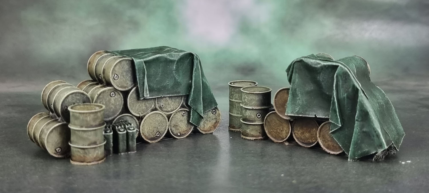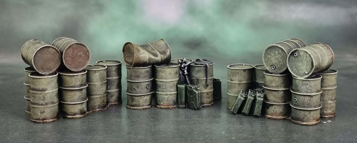 These ones were/are much smaller, so instead I shuffled the box off into a pile of other assorted products of things to “get around to” at some stage, and then of course did not get around to them. I didn’t have any Tamiya or GW barrels handy, but here’s one from Marvel Crisis Protocol and one from (I think) Maxmini – both of the “standard wargaming size”. So you can imagine my disappointment when the items pictured on the website turned out to be considerably smaller than expected. They’d probably work very well for smaller minis closer to 25mm than 32mm+ and games like Bolt Action. Hence the more “grounded” paint scheme I went with.