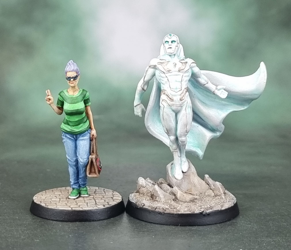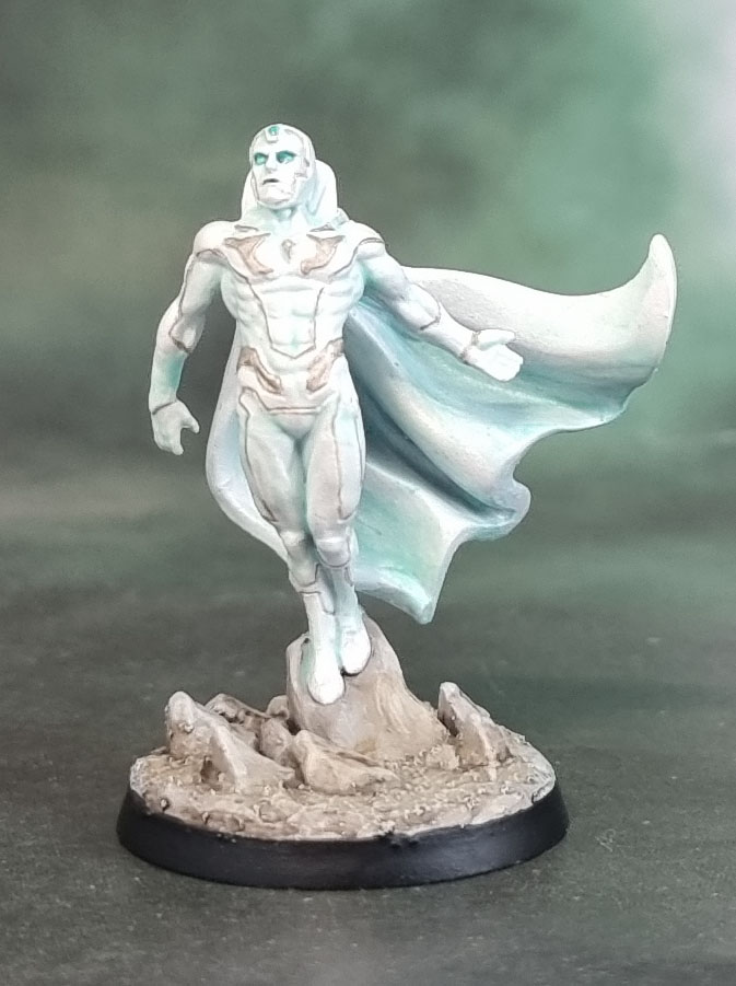I have to admit, I wasn’t aware of White Vision until recently – not because of Wandavision, but seeing the painted Marvel Crisis Protocol Vision model painted in white deco – most likely from someone in this blogging circle – but apologies, I can’t recall who it was. Then seeing that White Vision was a thing in the comics, and then later in Wandavision. This is another model for the list of ones that are tricky to photograph. White with subtle shading and pearlescent paint? Yeah, not great for my limited photography skills.