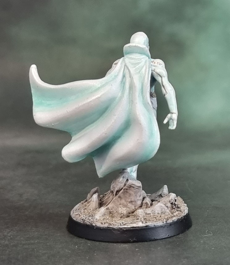 Since Vision is a duplicated hero for me – with a figure in the Heroes’ Resistance set as well as from somewhere in the mass of Kickstarter boxes, I wanted to paint them with some differentiation. On top of that, one of the Survivor cards has an ability called “Hologram”(they have different powers) – so for me that fit for this figure with his “floating over there” pose. So now we can use this model as Vision, or (once the other one is painted) we can also use it as the in-game hologram (basically, a decoy dummy).