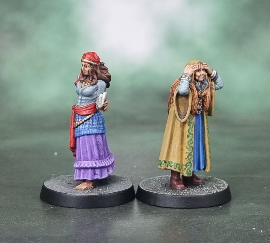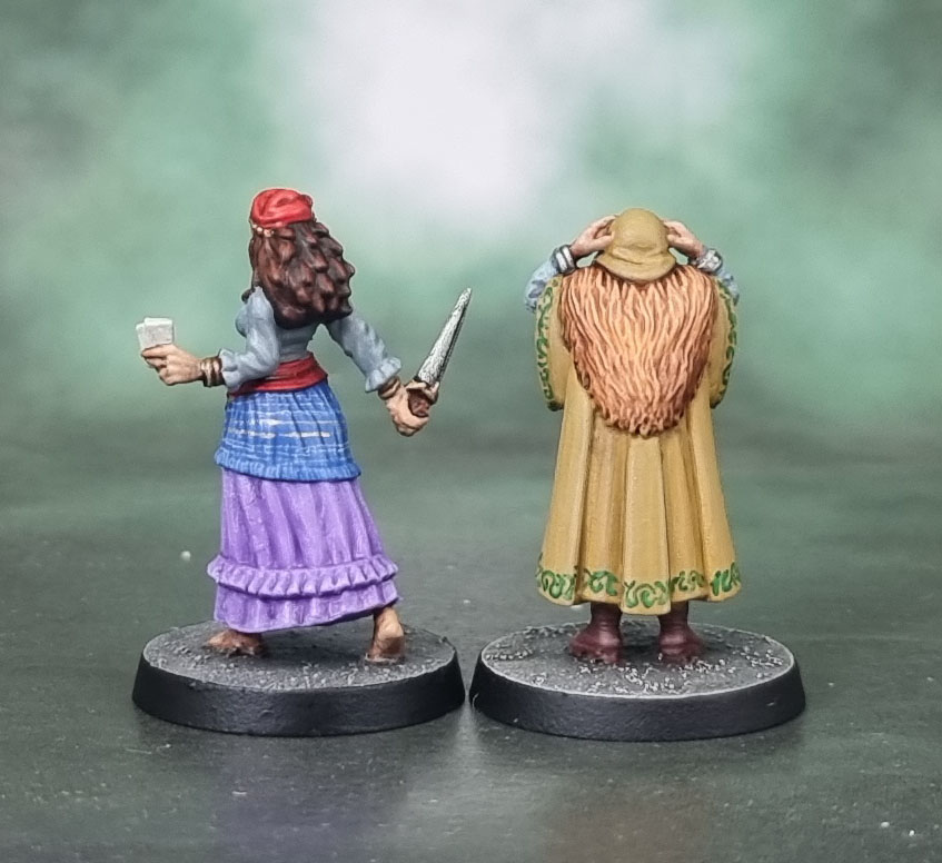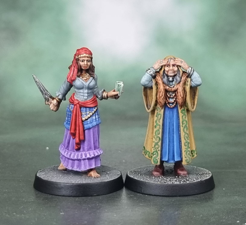 The first of this pair is Fatima Safar, an Occultist from Alexandria, Egypt for whom Tarot cards are but child’s play – which clearly explains why the sculpt is holding a pair. And I forgot to paint their backs. Once again our Death May Die sculptor turns out a technically fine model with an issue – this time it’s Fatima’s dagger arm, which is facing forwards rather than backwards. Kinda hard to see in 2D, but just take your right arm and hold an imaginary dagger in it in the manner that Fatima is here. Now, instead of the dagger facing out towards your right rear, rotate your arm so it’s facing towards your right front instead. Ouch. Anyway, Fatima wears another purple skirt (not lavender this time!) and a blue overskirt with patterns in both white and gold thread, which I attempted to simulate here.