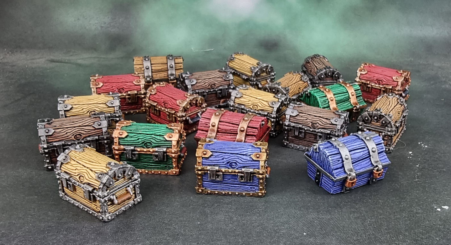A pretty quick one today – some chests I’ve been knocking out in small batches over the last few days. We were cleaning up a little (not that you’d notice!) and I found a tub with these in it, primed and forgotten about several years ago – because who needs more chests, right? Anyway, in order to get rid of them for good (and maybe good use in a game one day) I decided to smash the little bastards out. No idea where the pillars from this set are – I can’t find them on the blog, so they’re unlikely to be painted, so no doubt they’re also in a tub somewhere with other annoying little bits. Possibly primed but certainly waiting for me to come across them in a similar mood to the one that took me this past weekend when I decided to get the chests done instead of shoving the whole container to the side.