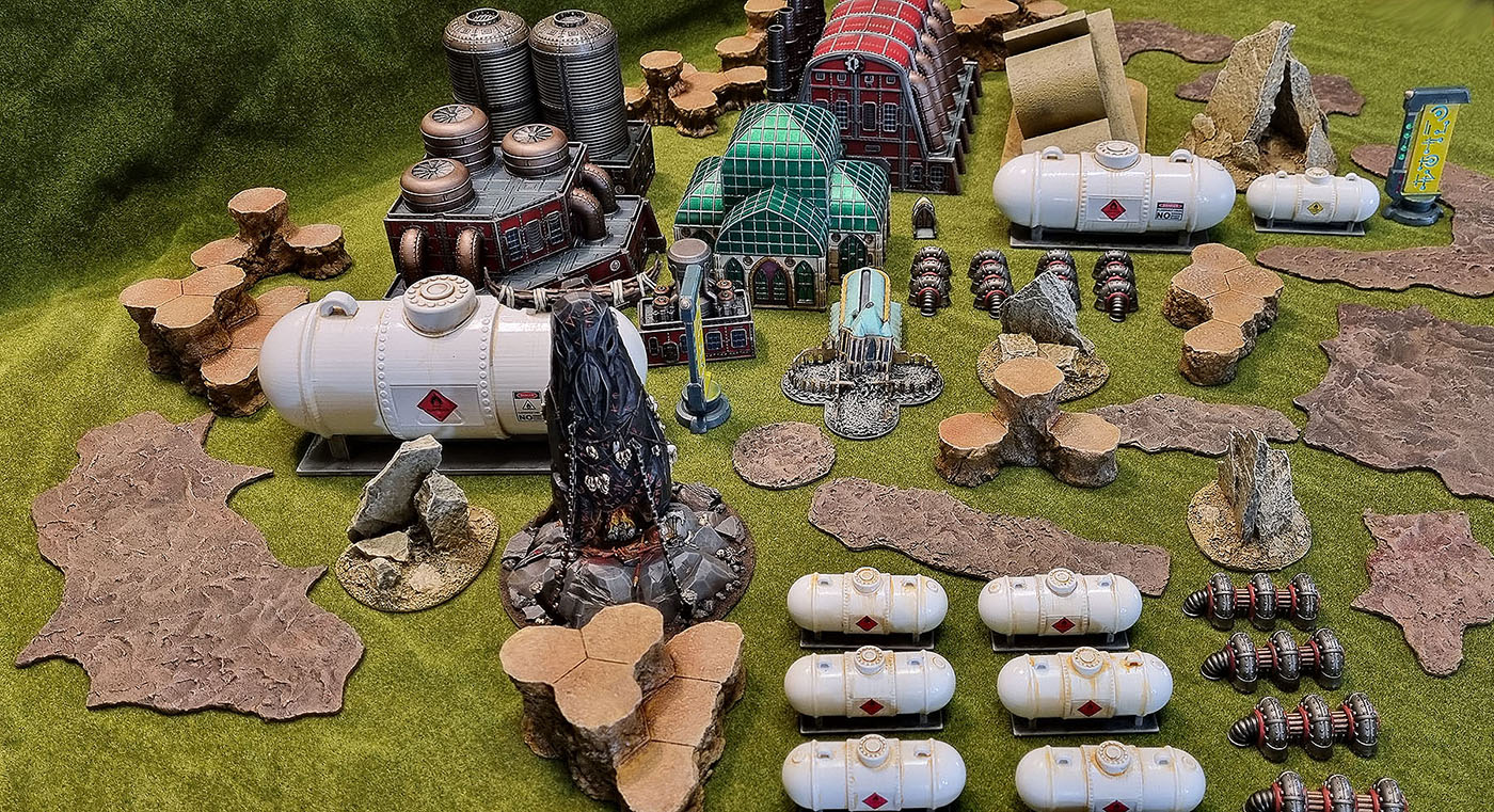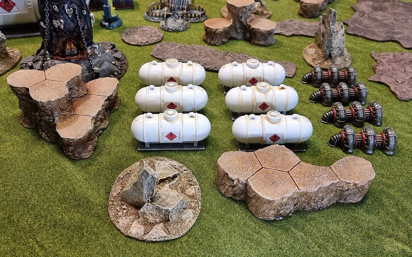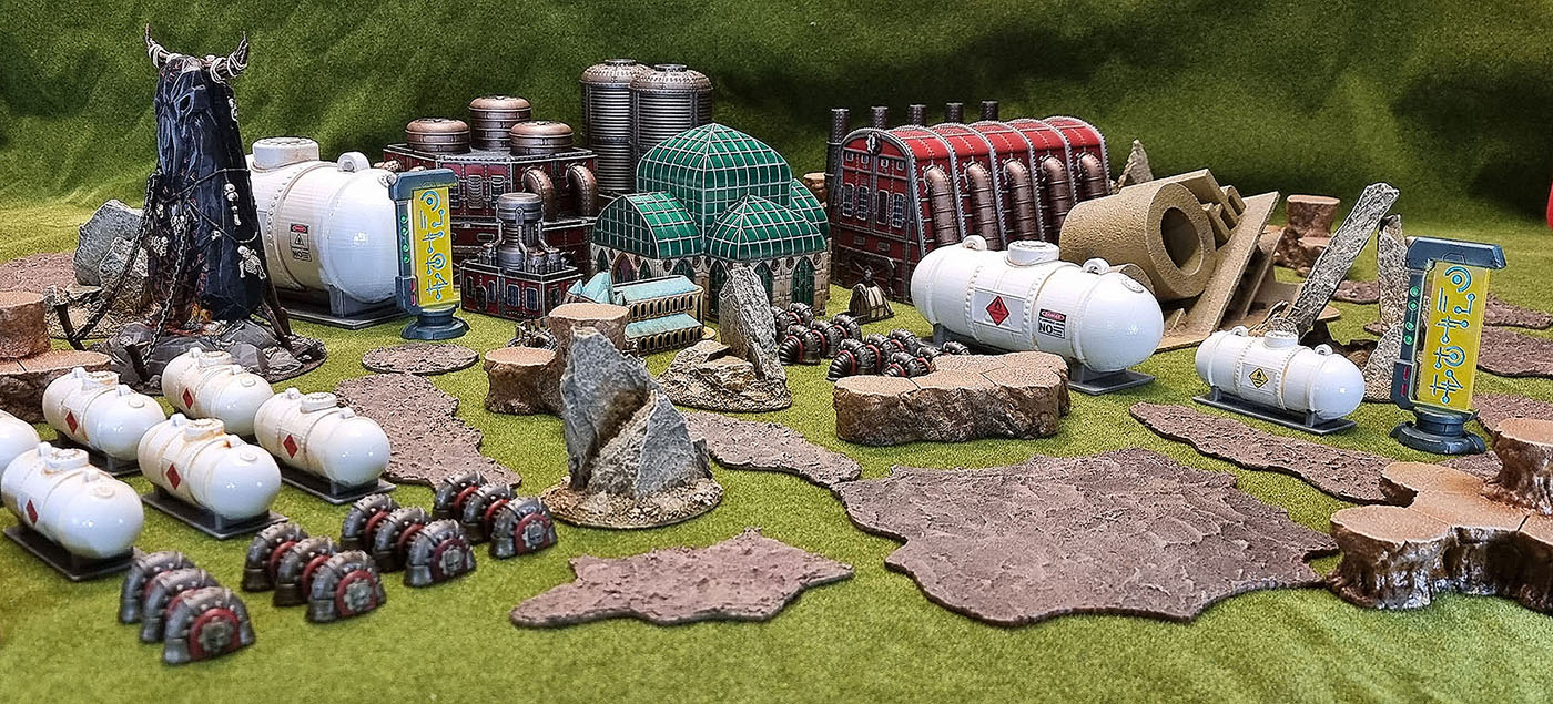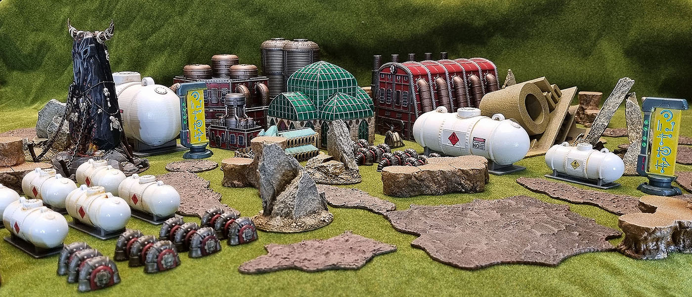 Wargame Forge’s Ruined Gothic Cathedral, nonPareil Institute’s Power Generator, and a family of 9x variously (re)shaped and (re)sized Propane Tanks by Syllogy.
