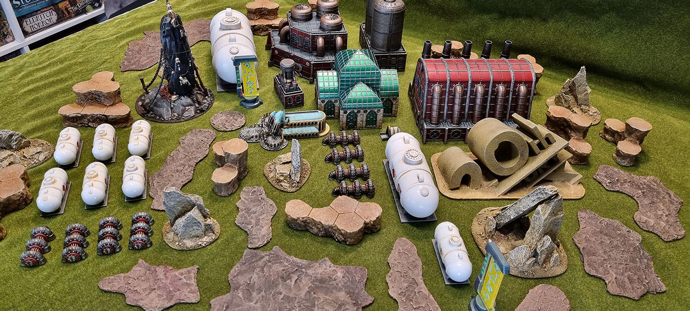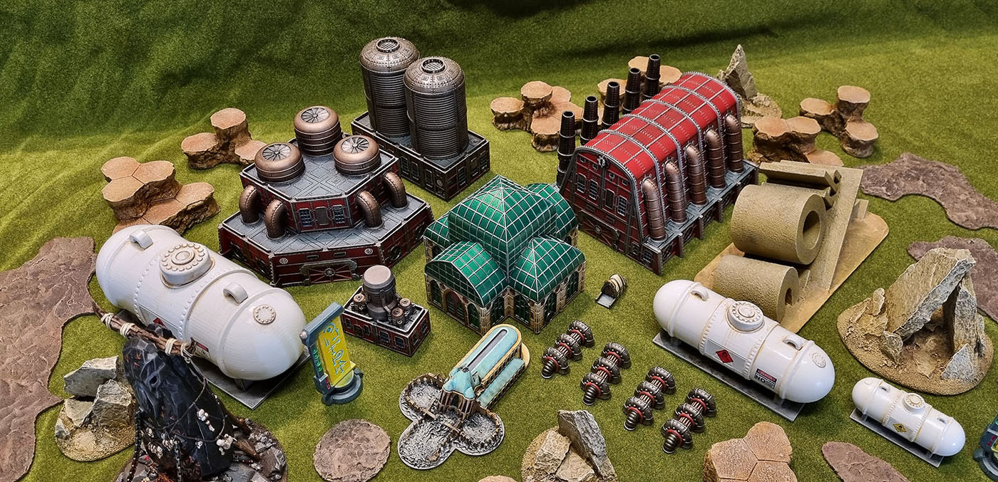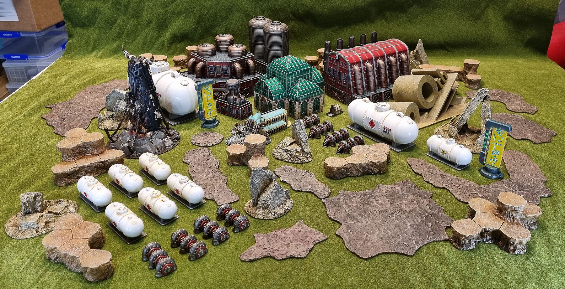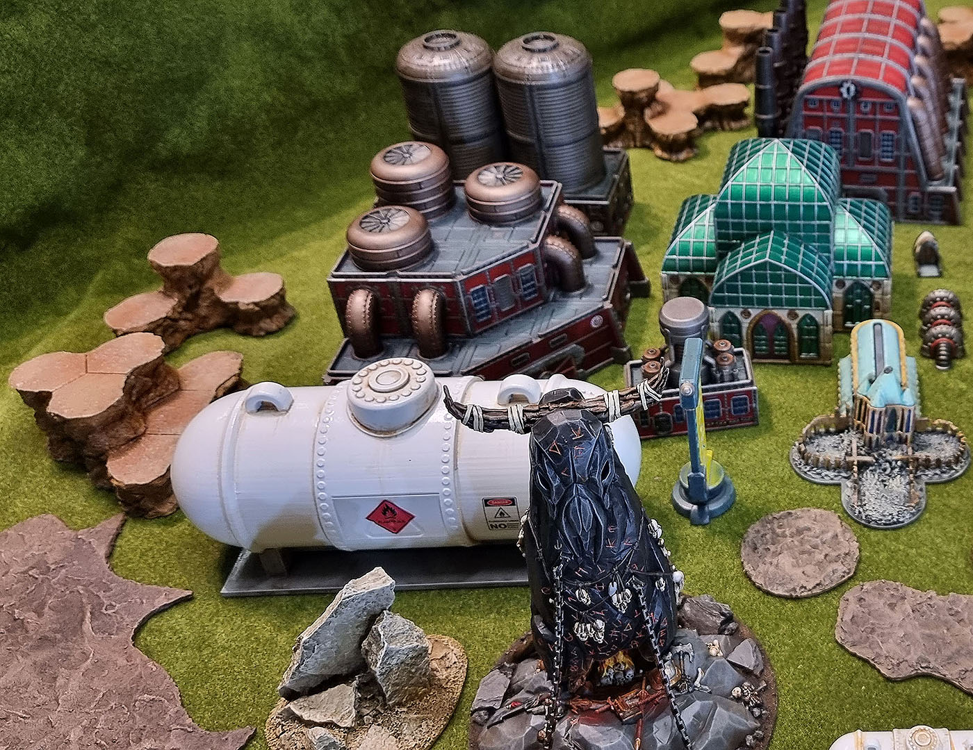 Fabricator’s Lair’s: Botanicae building, 8x Generators, a “1×2 Medium A” building/segment, a 2×4 Medium Building and a 2x of 2x2x2 silos, Grimdark Industrial Promethium Reprocessing Factory and Grimdark Industrial Forge.