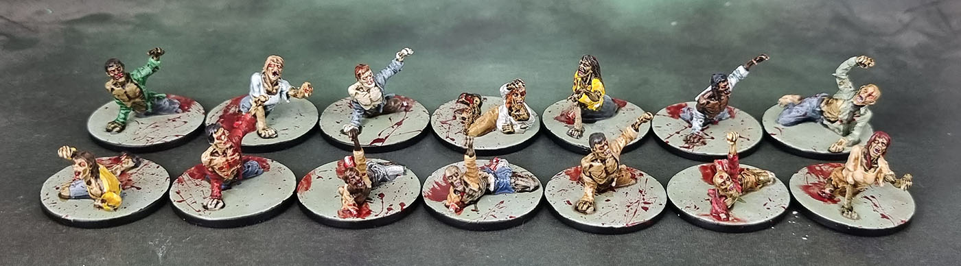 As it happened, I’d been stockpiling all of these zombies until I had them all “done” for the final, finishing touches – the blood spatter. After that, they’re properly completed. So when I finished the final batch of painting and then got them all together on the night of the 27th/early am 28th and spattered them with blood, they were then ALMOST complete. On the night of the 28th, I went in with the brush to add the final bloody touches where needed (around bones, open wounds, etc) meaning these models were actually
