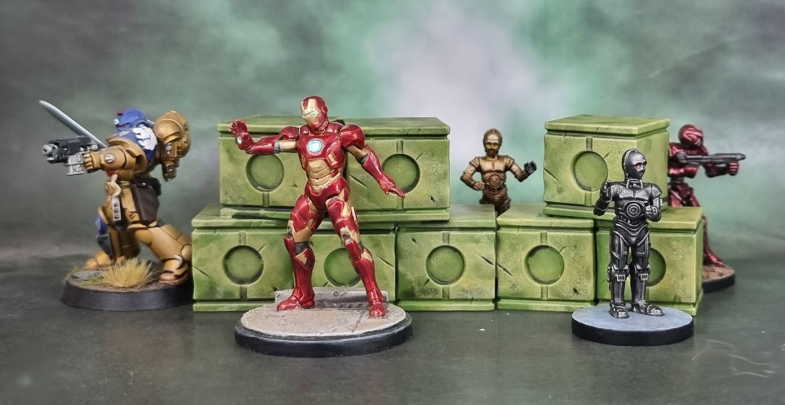 The other half of this post are these crates. When stacked, they’re pretty tall, regardless of whether they’re next to the smaller Imperial Assault minis or oversized Crisis Protocollers. Now I painted a set of these things quite awhile ago, and so I wanted to do something else with these ones. After all, I’ve certainly painted enough generic looking individual paints to last me more than a lifetime. In fact, if I ever find where I put that first set, I’ll probably glue a few of them together as well to turn them into small barricades instead of bits of full-ignorable decoration.