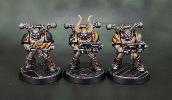 Transfers are from the Forge World Iron Warriors decal sheet. Oh, and I sliced the “joined horns” off the guy on the righthand side. I don’t particularly like those (or these giant ribbed horns, truth be told) on my Chaos Space Marines. They don’t really fit my image of what I want for my Iron Warriors force. I see them much more as Renegade Marines than as Slaves to Chaos, so you probably won’t see another set of those giant horns anytime soon (smaller ones are okay, in limited use). I mostly wanted to avoid very similar chop-ups on 2 of the 3 models here, and being combination boardgaming models and proof of concept models for the proper force, just let them be.