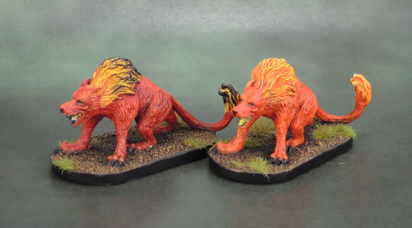 Descent uses two different “types” of each monster: “White” ones, which are normal, or trooper-types and “Red” ones which are champion-level and tougher. So the sculpts come in two colours of plastic – Red and White (actually, more of a cream, but I digress). In order to be able to identify the two types, I painted the “White” ones with brighter orangey-red and red-to-yellow flame-fur, while the “Red” ones were painted in a slightly deeper, darker red and have yellow-to-black flame-fur. Enough to distinguish them when needed, but close enough that they still work in a pack for other games.