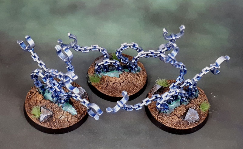 The models of these chains are coming out of (obviously magical) mini-chasms in the ground underneath, and so I used crackle texture paint on the raised dirt around the edges to create badly cracked earth to better integrate the models with their own bases, and then when I felt the black looked too plain and boring, filled them with white and then Nihilakh Oxide to create the impression of a magical blue glow in the rends in the earth that these chains are spawning from. Of course, I could have gone to town with OSL and all the rest, but to me that felt a lot like absolute overkill considering what these models are, and are for.