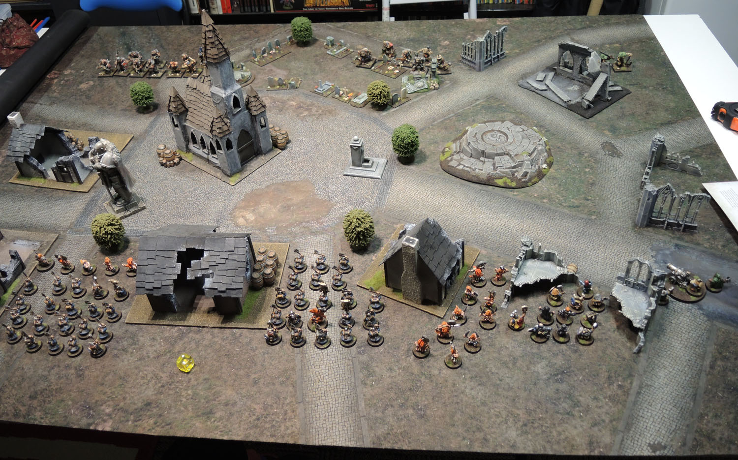 I didn’t set up a full 40k mock battle, nor any historical skirmish games because it literally takes hours to get out all of the stuff, set it up, photograph it and take it away for photos, but the actual AoS game being played on it shows it’s versatilty pretty well, along with those scale shots. I think this mat works very well for a variety of genres and a variety of scales. I could easily use this mat for 40k and it’s derivatives, Fantasy Battles/9th Age/Kings of War with fewer buildings, Age of Sigmar and other more densely built up fantasy skirmish like Mordheim and Frostgrave (if you play outside of the snow!) or Malifaux (in a sectioned-off area, or the smaller versions). It also works across period and scale quite nicely, as demonstrated by the below set of photos, so 20mm games such as Flames of War/Team Yankee/Crossfire will work as well as Bolt Action or SAGA with Romans or SAGA with Crusaders.