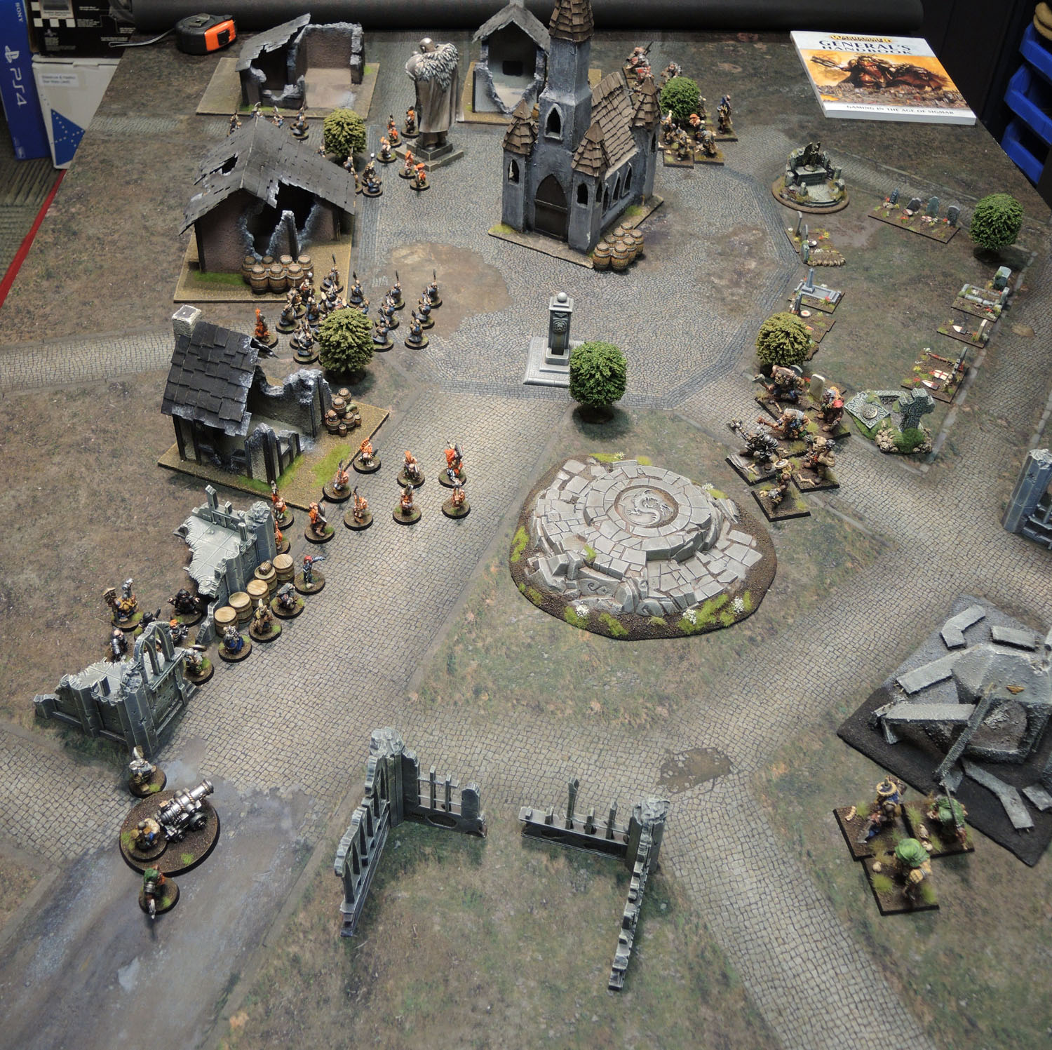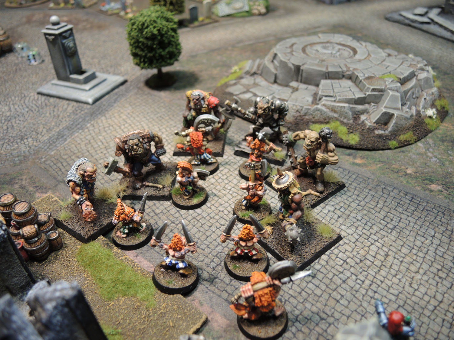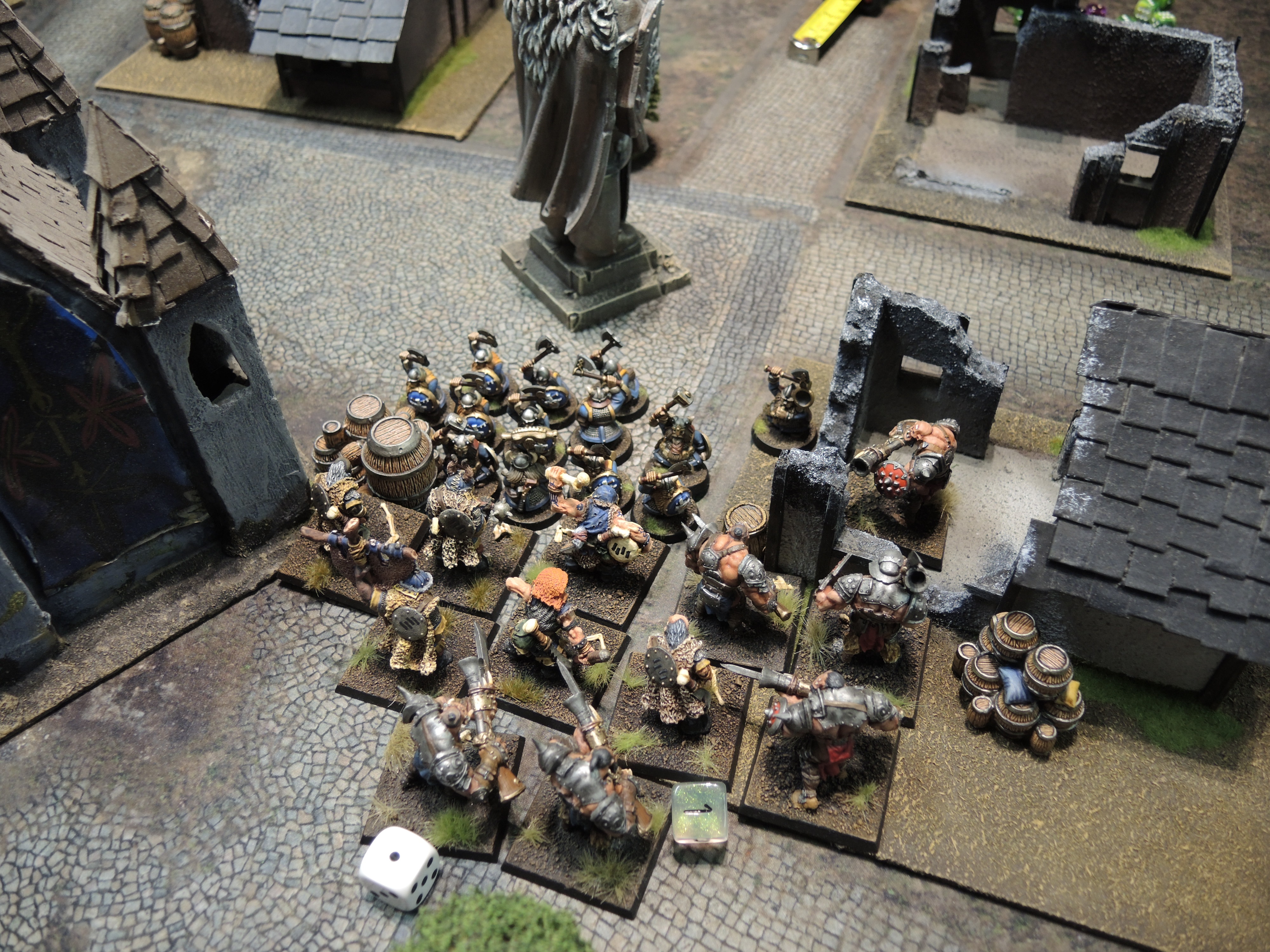 As with the other mats I’ve gotten from Urbanmatz, the design is printed onto neoprene (mouse pad material) and is once again quite nice. This time, the game I’m using to showcase the mat is an Age of Sigmar clash between Dwarves and Ogres, set in an unnamed Old World city (because I can use the ruleset without the background!) We were trying out the rules, so it’s an actual game rather than a mockup.