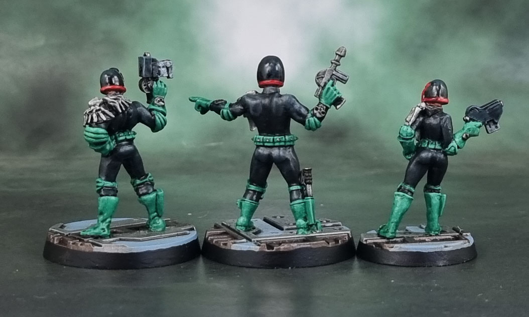 The other three models are all SJS Judges – the extra-large model is Foundry’s model of Judge Slocum, who you can read a lot more about here, in Sho3box’s rather excellent post from 2011. The other two models are again from Mongoose. I’ve seen SJS judges with both a red tunic trim as well as the cold grey. Being characters from 2000AD, it’s not surprising for smaller elements to have been coloured in more than one colour over the years – just look at Judge Knee/Elbow pads for example – are they green or gold? Yes!