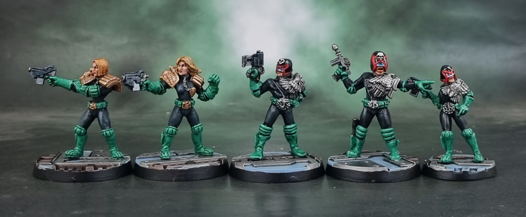 It’s been a couple of years since I painted any of my collection of Judge Dredd miniatures, and while rooting around in a tub of figures looking for some other things, I found this set of five, cleaned, primed, glued to bases, and even with most of the work on their bases already done – given that this last month’s challenge from Dave Stone’s is Apocalypse Me where he very explicitly mentions that Mega-City Judges qualify – how could I resist putting in the work to finish them off?