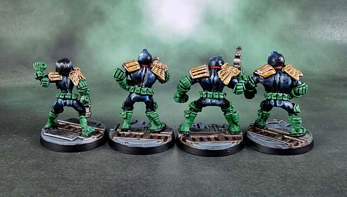 The four Judges from (our) left to right are Judge Hershey, Gallagher, Dredd (v.2) and Bambra – who appears to have been sculpted to be leaning on a bike or something. In the end and after a slightly rough start, I really enjoyed painting these. The biggest issue that they caused was wanting to immediately grab out another four of them to work on once I completed them – and I have SO many other models to paint. That’s the beauty of these challenges and even sub-challenges. I’m hoping Dredd makes a cameo in a future challenge so I can have an impetus to gran a few more of them. 🙂