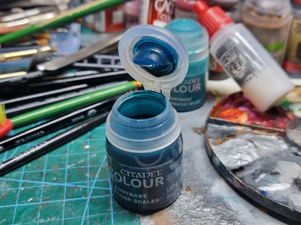 Then coming back later to add some Tessaract Glow to the “knees”, and add some Contrast Kroxigor Scales to the tips of the legs as well as the underside of the body. Pretty great paint pot, as well. (look closely!) Eyes picked out with Contrast Blood Angels Red. For basing it was some AK texture paste, drybrushed with the usual and some tufts added.