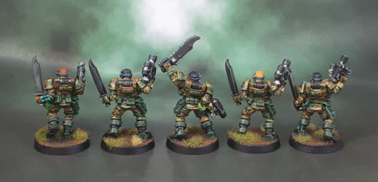 Despite my lack of blog updates recently, I’ve still been painting on a reasonably regular schedule. Just the process of photographing and writing about the models hasn’t really appealed to me lately. You know how it goes – many of us are hot and cold at different times. These models for my Mentor Legion force were all completed in January and just hadn’t been photographed until last weekend, and so I’m writing about them now. As with all my stuff painted in January (which is when these guys were finished) these models go toward my tally for Dave Stone’s Paint What You Got Challenge. In this case, they very much fit the theme of Dave’s challenge!