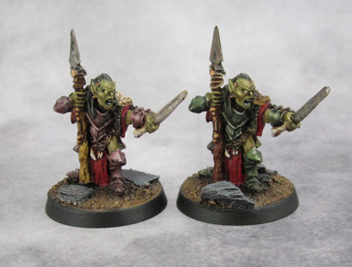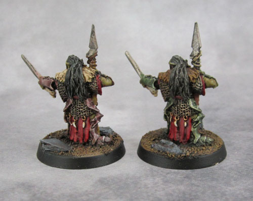 These two were a nice surprise. I thought I had some shamans, somewhere but couldn’t for the life of me find them. I gave up and grudgingly resolved to buy some at some stage, and then lucked out and found these guys, along with a bunch of unpainted Gundabad Blackshields. Since I’ve got two of the same sculpts here, I added some colour to distinguish the two by glazing their armour plates with Army Painter red and green washes. These, as with the sepia washed armour on the King kept the palette within the one chosen for the army while giving both models a bit of individuality.