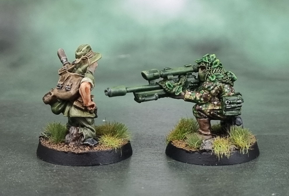 It’s been quite a while since I’ve completed any of the Last Chancers, and so I took the opportunity this month to get this pair of models finished and off the desk after having been there for a loong time. One of the two continues the historical aspect of this group of models. “Fingers” here, who appears to from the “Bushmen of Serica” regiment is inspired in my opinion by Australian WWII troops. Lore-wise, “Fingers is an expert forager and petty thief who can get a hold of just about anything for a price.” I guess this is because to an unfortunately large number of people in the UK and US, Australians are all petty criminals who ride Kangaroos to work and dodge man-sized spiders and drop bears on the trip. Much like all Americans wear cowboy hats and walk around with an AR-15 and all Brits wear monocles and walk around with a cup of tea, and all Frenchmen wear those stripey shirts, a beret, a necklace of garlic while halding a baguette, and all Scots are kilt-wearing drunkards… 👀