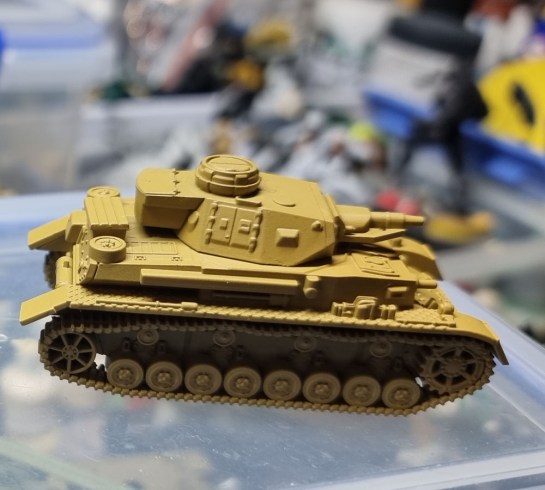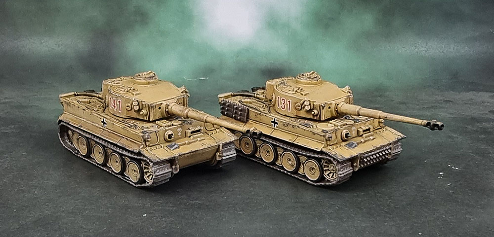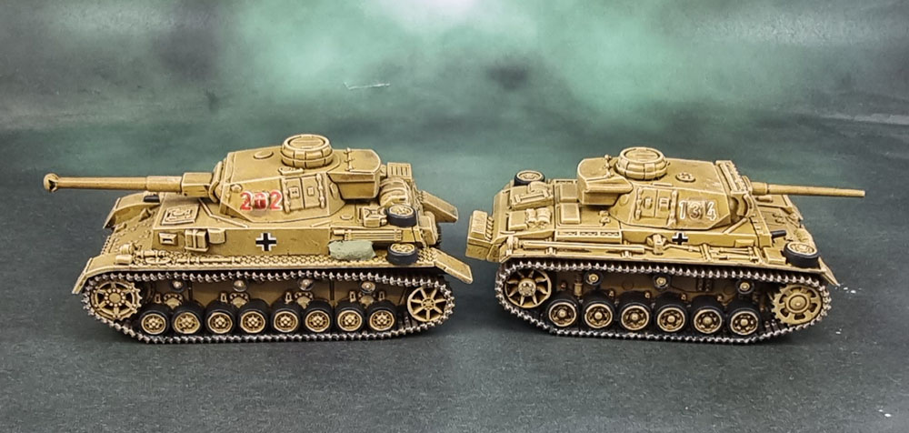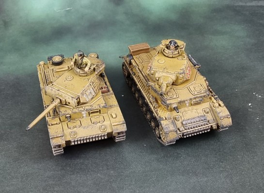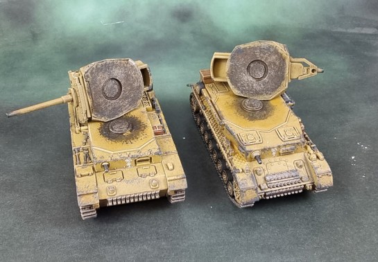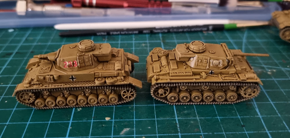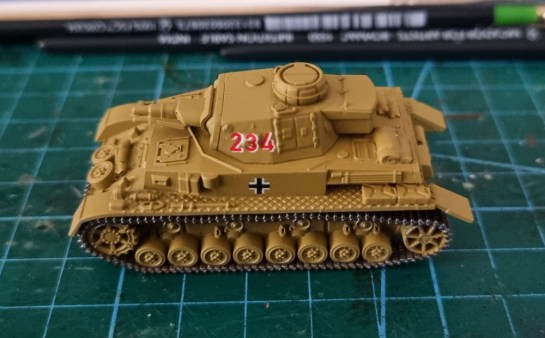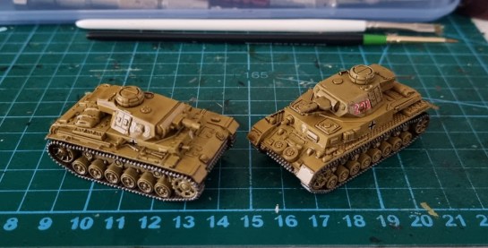 Chipping – I found that a “proper” panzer grey looks too black against the sand colour that the armour is painted in, so I used Vallejo Model Colour Dark Grey (70.994). Put a little on your palette, use a small bit of torn foam on the end of a pair of tweezers and dab it into the paint. Dab most of it off onto the paper/a tissue etc and then carefully touch it to the edges and panels of the tank to taste – again, be careful to not overdo it – it’s easy to go back later and add more, but a bitch to try and remove it!
