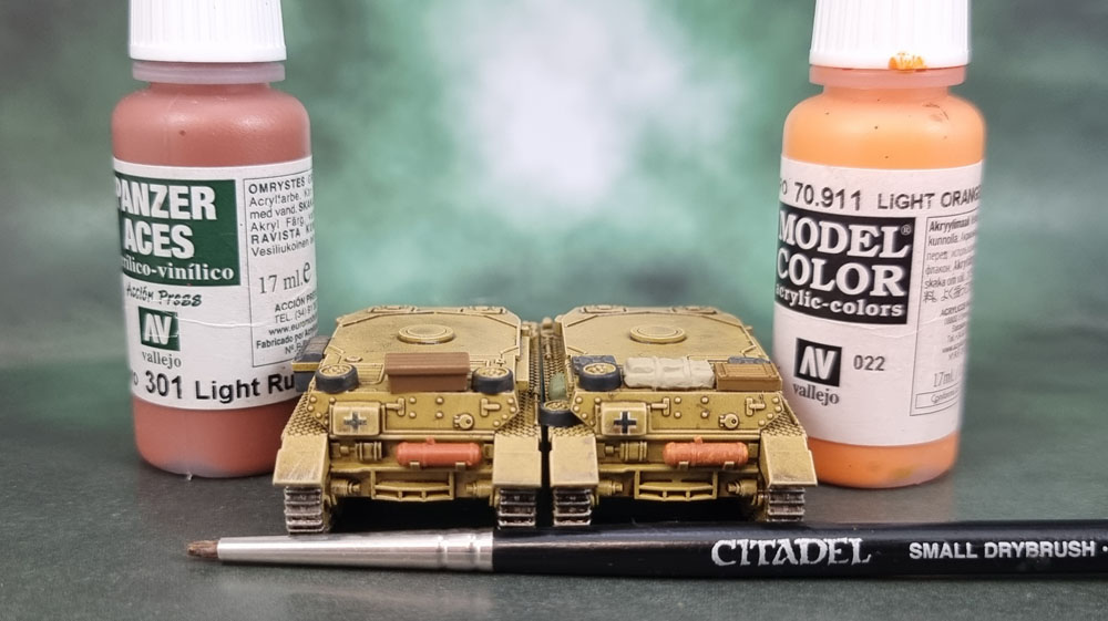 For the exhausts Vallejo Panzer Aces Light Rust (301), then carefully and lightly stippled with Vallejo Model Colour Light Orange (70.911). We’ll wash that with Agrax Earthshade Gloss to bring out the details and darken it a little. You may even choose to give it a followup coat of regular Agrax Earthshade or Army Painter Strong Tone if you prefer darker exhausts.