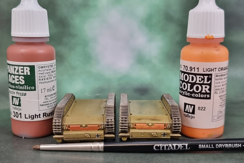 STEP 3: Paint Tracks with Vallejo Panzer Aces Track Primer (304). Try to be reasonably neat, but mistakes can of course be fixed up with that Green Ochre mentioned above.