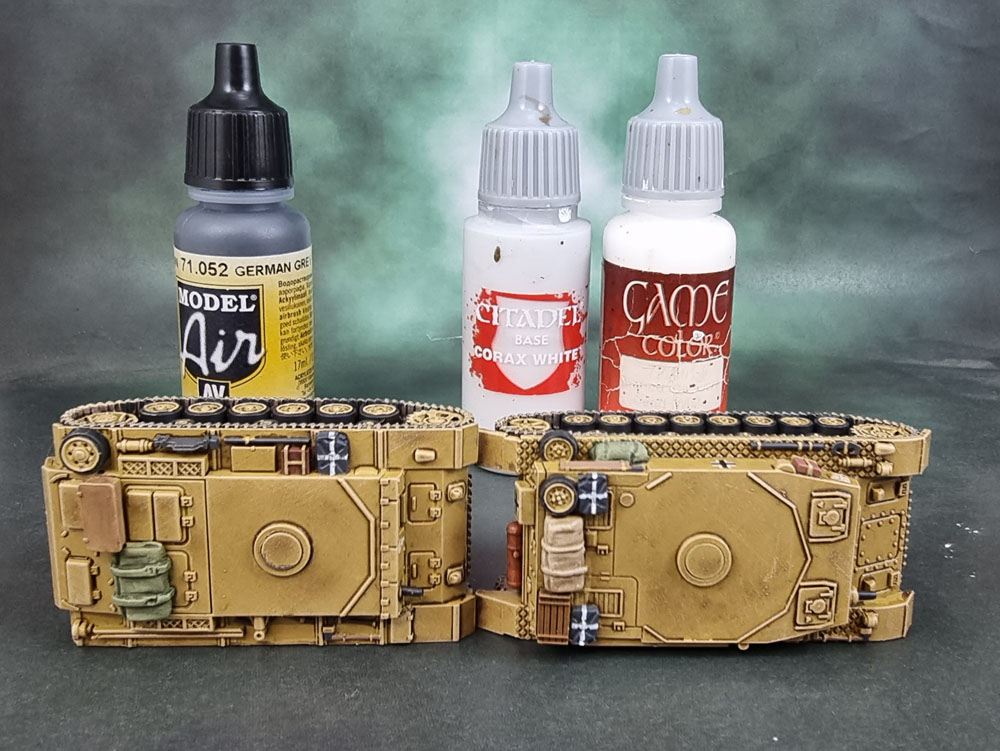 Jerry cans – I like using Vallejo Model Air German Grey (71.052), with thin Citadel Corax White for the crosses on Jerrycans – with little picked out bits of Vallejo Game Colour Dead White (72.001) (or whichever brand you like) for highlights. For those little integral boxes caged on the sides of Panzers I use Vallejo Model Colour Saddle Brown (70.940),