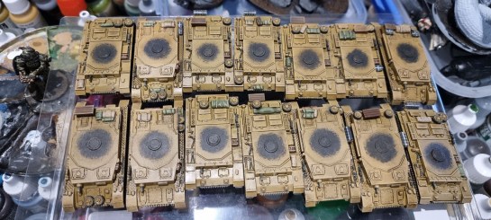 This pic shows one side of models after washing en masse,. Make sure you let the Agrax Earthshade Gloss dry for a good amount of time, then flip them and do the same again before finally placing them upright on their tracks and washing the rest of the hull.
