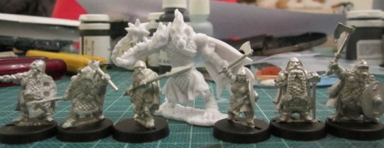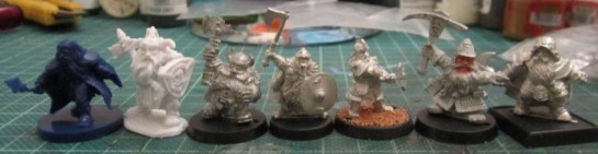 Red Box Games Orcs in a lineup of figures. GW Goblin, RBG Goblin, RBG Orc, ????, RBG Orc, GW Orc, RBG Orc, GW Marine