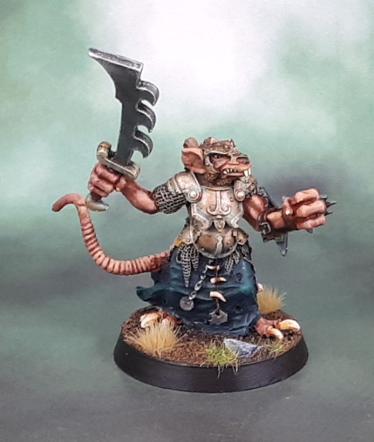 I really like this sculpt, though I did get totally blocked for a couple of months by the difficulty of figuring out a colour scheme for him. Specifically, I could not figure out how to paint his robe. Eventually, I got to a knuckle down point and was still struggling when inspiration came – one night after finishing up with painting and such, I thought to have a look through the Skaven Battletome for AoS, and saw this deep green scheme on some model, and after seeing it, I knew what to do. The next day, his skirt was painted, and a day or two later the model was finally complete! I even snuck a little touch of Wudagast Yellow onto the model.