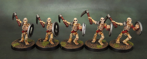I’ve painted up a couple of units of “Fir Bolg” Skeletons from Brigade Models now, and this makes the third. Or the fourth, depending on whether I count those spearmen as one or two units, as they can make for either a Horde or two Regiments. I know I’ve got another 16 archers (two troops of 8) to paint as well, so once I clean up my desk in the next week, I’ll spend some time cleaning the archers up and then hit them with the spray can. This time, we’ve got Skeletons with Sickles.