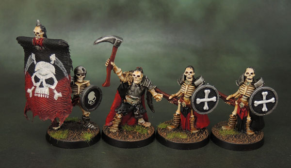 The standard came from one of the other Fir Bolg skeleton sets, and working out how I’d create the banner took a bit of time. Eventually I settled on a cloth banner, cut from the material taken from an old pair of shorts and fixed with PVA. The Hero is actually their Skeleton Leader with Axe model, with the axe cut and trimmed into a sickle of sorts. I painted the second of the two champions with the same Par Chevron, though reversed. I’d like to move him to a different unit down the line, and perhaps replace with a drummer, but another £3.50 for a drummer feels a little steep when the champion – a mod of the same base figure plus two troopers runs £4.00 by comparison. I dunno. I’ll figure it out later. I’d originally planned on giving the two champions different shields as well, but when it came time to complete the command figures, I realised that the shield I’d initially selected would not have looked good angled at 90 degrees, and by then I had already ended up using the last “horned skull” shield on one of the troopers, and didn’t feel like tearing the superglue-and-greenstuff mod apart.