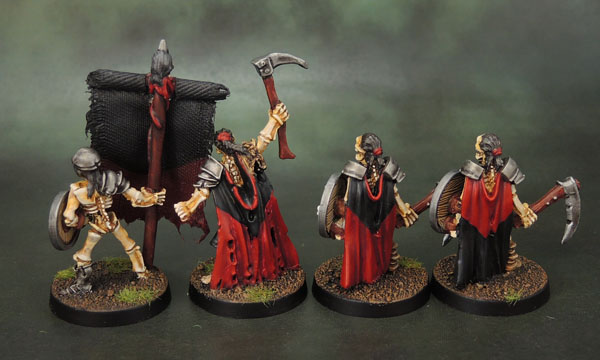 Only two sculpts, unfortunately. I like having one-piece metal sculpts for these models, but I do wish there was a little more variety in the number of sculpts, like there typically was in the Old(Hammer) days. The shields also reveal that rather than having given the models that lack sculpted shields freehand shields, I used some of the old-school, 20-year-old Warhammer Undead shield decals that I found recently. Once again, these guys were painted using the “Warm Bone” method, starting with a cheap cream spray can from the local hardware store – with much of the work done bit by bit during lunch breaks at work. The final work was completed last Monday, so these guys also qualify as my September Undead entry for the Tale of Painters challenge over on Dakka.